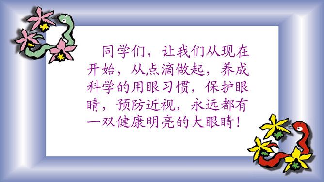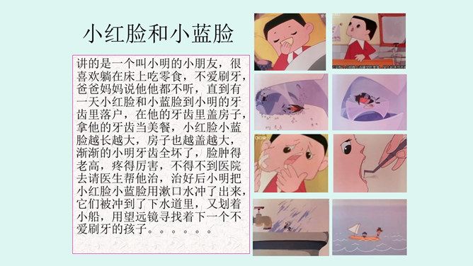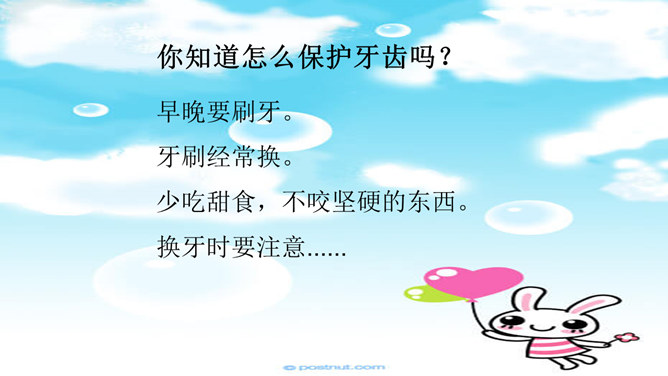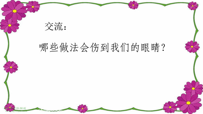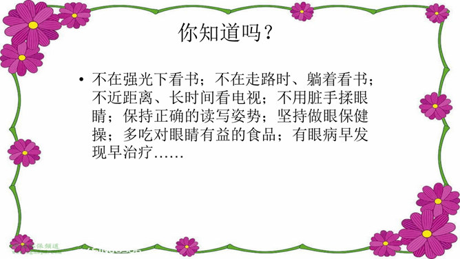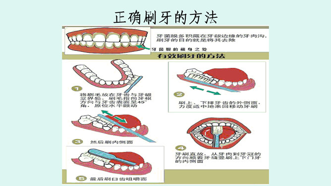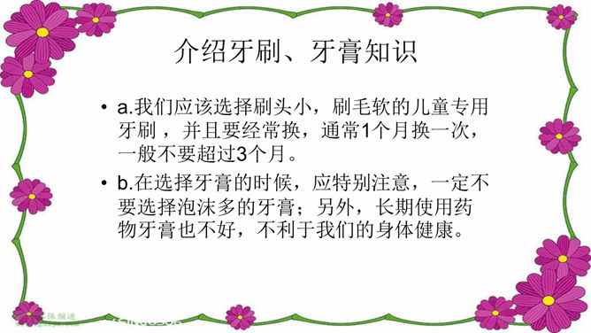 介绍牙刷、牙膏知识:我们应该选择刷头小,刷毛软的儿童专用牙刷 ,并且要经常换,通常1个月换一次,一般不要超过3个月。在选择牙膏的时候,应特别注意,一定不要选择泡沫多的牙膏;另外,长期使用药物牙膏也不好,不利于我们的身体健康。你知道怎么保护牙齿吗?早晚要刷牙。牙刷经常换。少吃甜食,不咬坚硬的东西。换牙时要注意......交流:哪些做法会伤到我们的眼睛?光线太强了,对眼睛不好。讨论:看电视保持多远的距离才正确的呢?不在强光下看书;不在走路时、躺着看书;不近距离、长时间看电视。所属专题:我们爱整洁ppt。