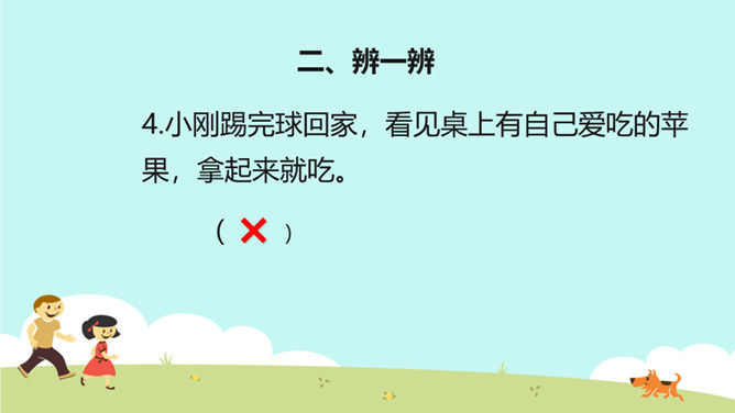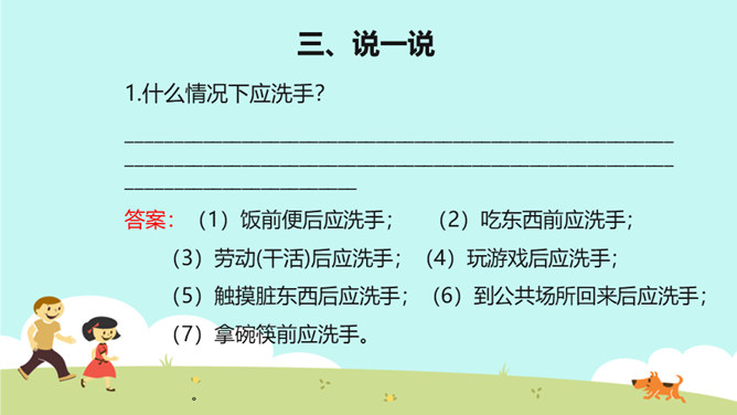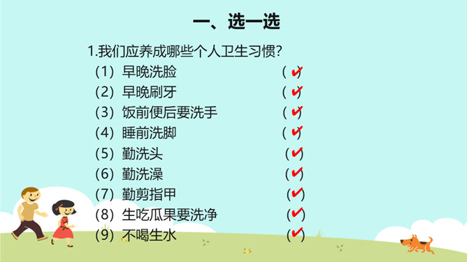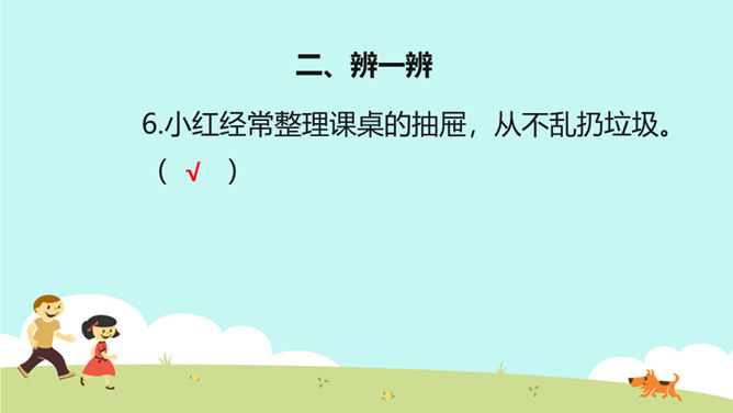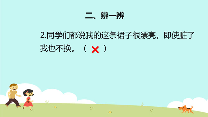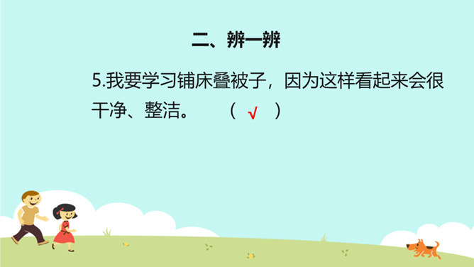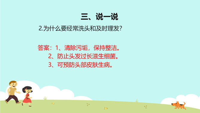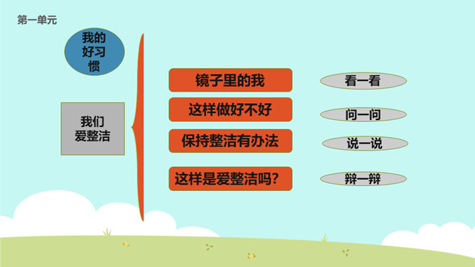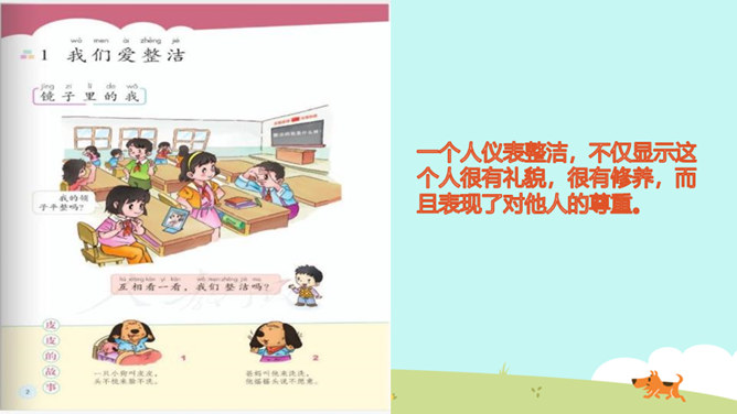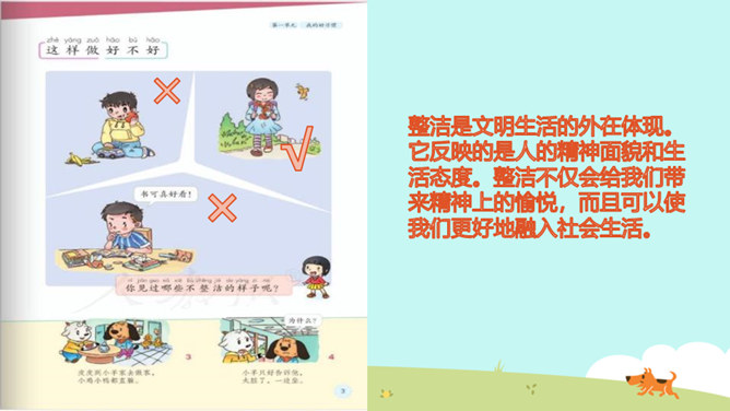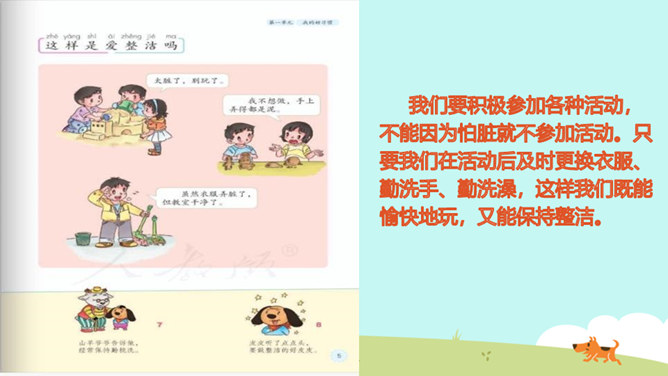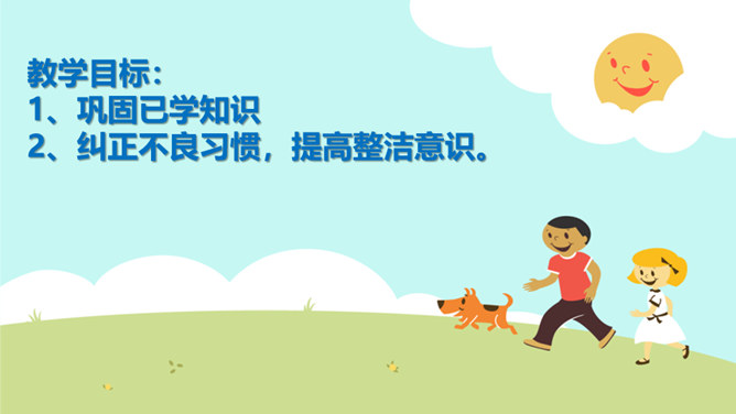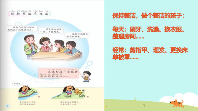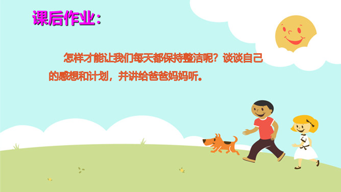 教学目标:巩固已学知识。纠正不良习惯,提高整洁意识。一个人仪表整洁,不仅显示这个人很有礼貌,很有修养,而且表现了对他人的尊重。整洁是文明生活的外在体现。它反映的是人的精神面貌和生活态度。整洁不仅会给我们带来精神上的愉悦,而且可以使我们更好地融入社会生活。保持整洁,做个整洁的孩子:每天:刷牙、洗澡、换衣服、整理房间......经常:剪指甲、理发、更换床单被罩......我们要积极参加各种活动,不能因为怕脏就不参加活动。只要我们在活动后及时更换衣服、勤洗手、勤洗澡,这样我们既能愉快地玩,又能保持整洁。所属专题:我们爱整洁ppt。