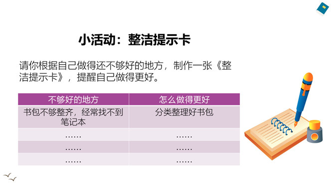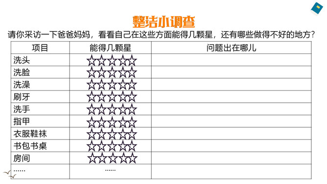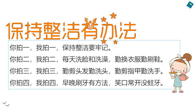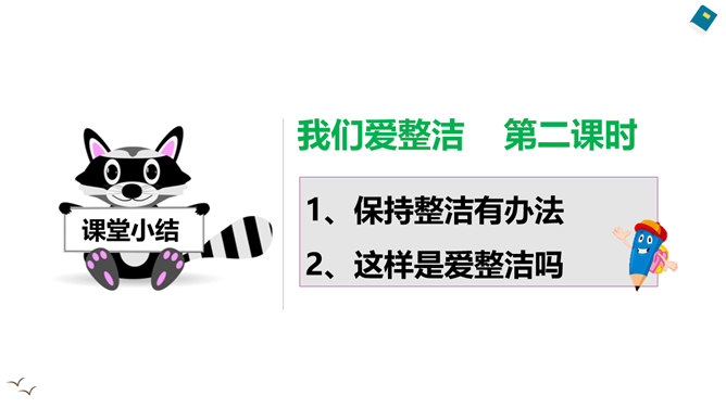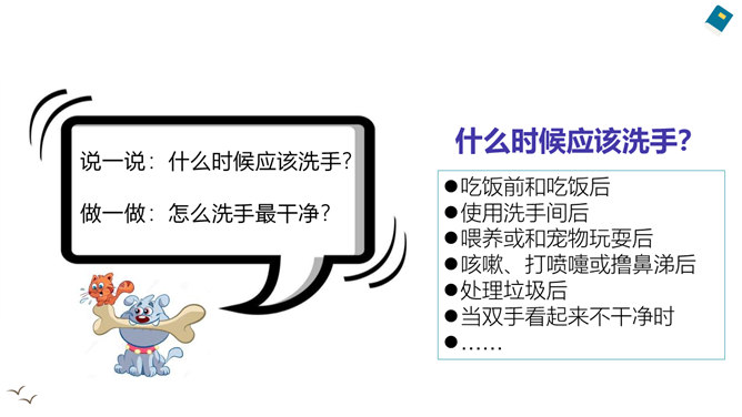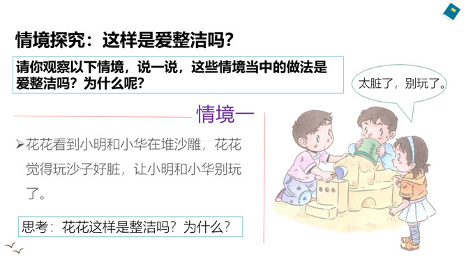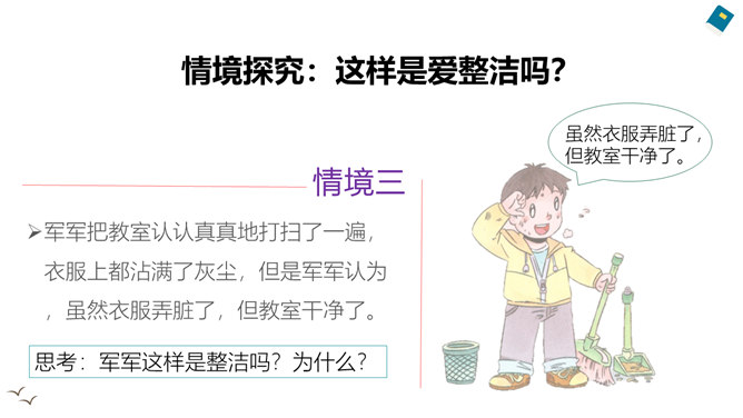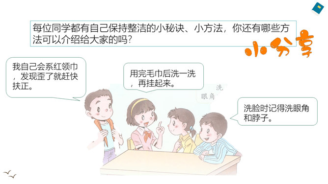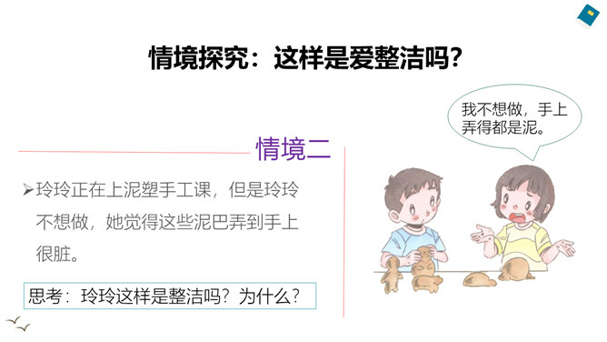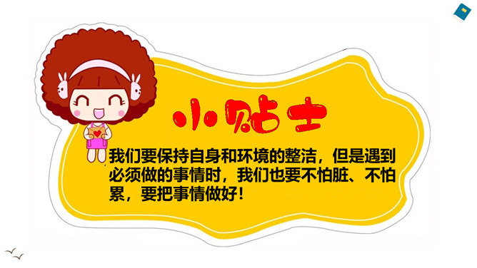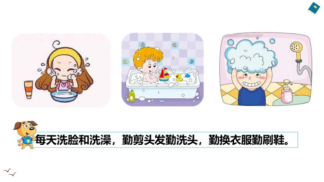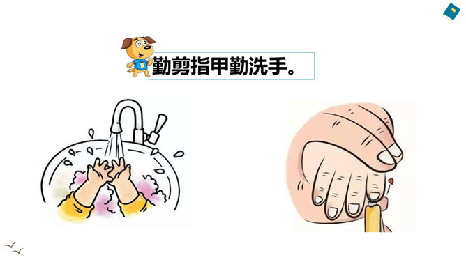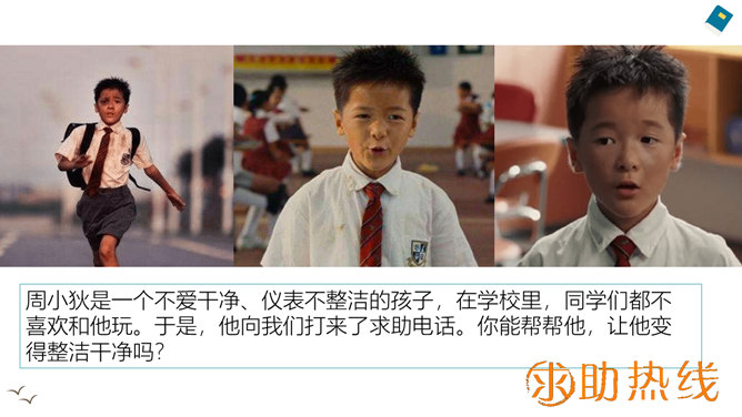 周小狄是一个不爱干净、仪表不整洁的孩子,在学校里,同学们都不喜欢和他玩。于是,他向我们打来了求助电话。你能帮帮他,让他变得整洁干净吗?每天洗脸和洗澡,勤剪头发勤洗头,勤换衣服勤刷鞋。勤剪指甲勤洗手。说一说:什么时候应该洗手?做一做:怎么洗手最干净?请你观察以下情境,说一说,这些情境当中的做法是爱整洁吗?为什么呢?位同学都有自己保持整洁的小秘诀、小方法,你还有哪些方法可以介绍给大家的吗?所属专题:我们爱整洁ppt。