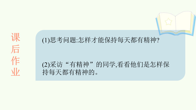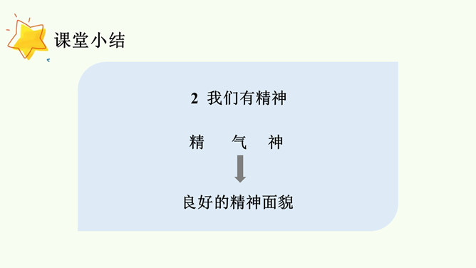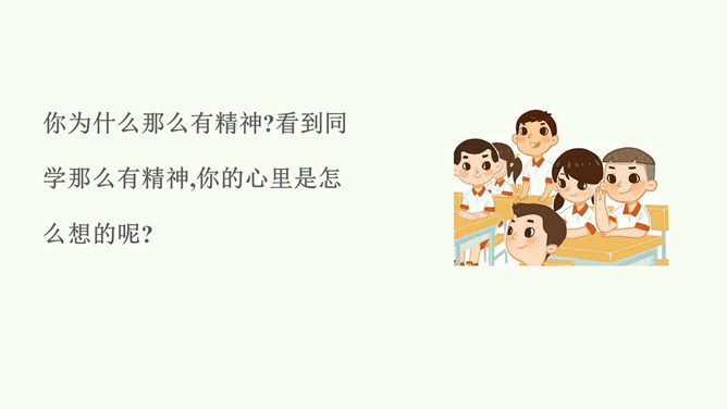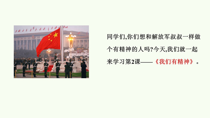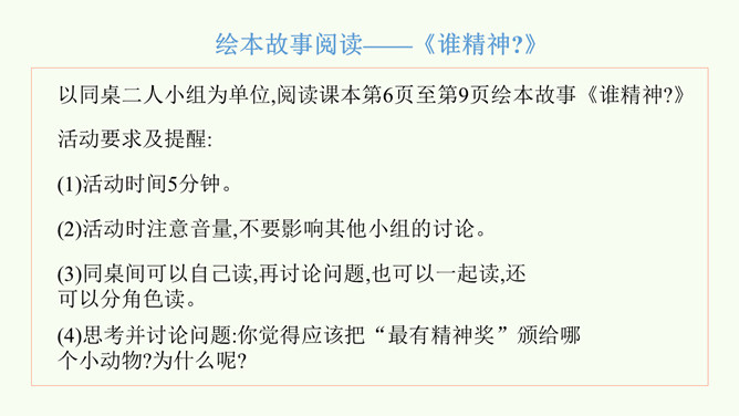 同学们,你们想和解放军叔叔一样做个有精神的人吗?今天,我们就一起来学习第2课。以同桌二人小组为单位,阅读课本第6页至第9页绘本故事《谁精神?》活动要求及提醒:(1)活动时间5分钟。(2)活动时注意音量,不要影响其他小组的讨论。(3)同桌间可以自己读,再讨论问题,也可以一起读,还可以分角色读。(4)思考并讨论问题:你觉得应该把“最有精神奖”颁给哪个小动物?为什么呢?图中的小朋友给你带来了什么感受?你为什么那么有精神?看到同学那么有精神,你的心里是怎么想的呢?思考问题:怎样才能保持每天都有精神?所属专题:我们有精神ppt。