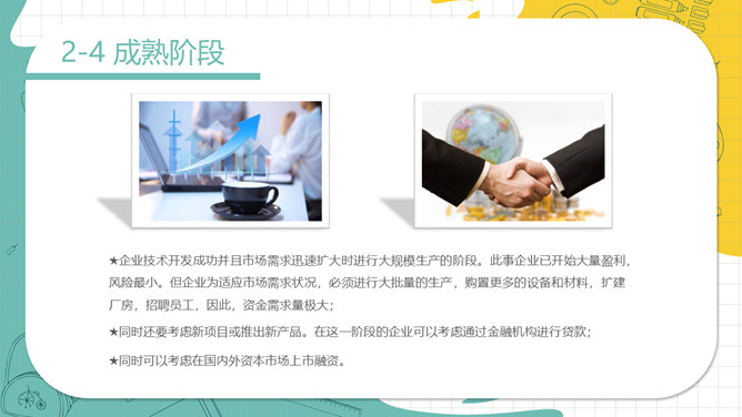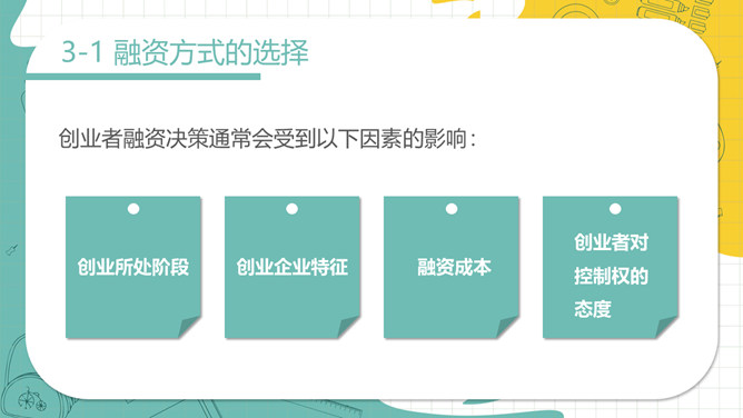 大学生创业大赛指导PPT模板。包括融资渠道、企业融资的过程、融资方式的选择、创业企业融资方案策划技术、创业企业融资能力提升技术。