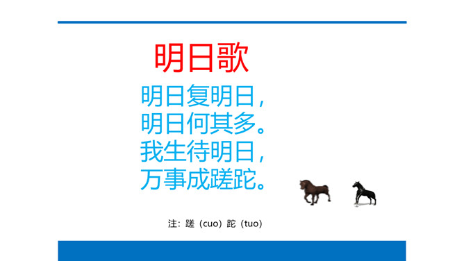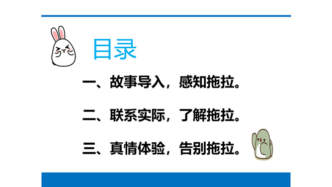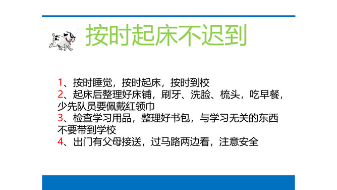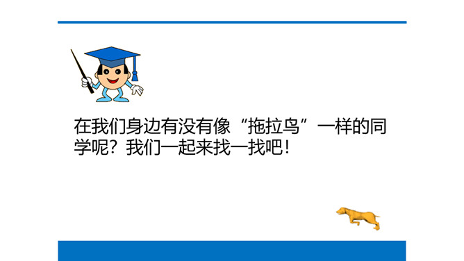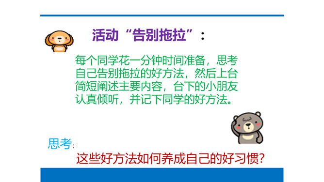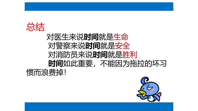 在我们身边有没有像“拖拉鸟”一样的同学呢?我们一起来找一找吧!总结:对医生来说时间就是生命,对警察来说时间就是安全,对消防员来说时间就是胜利,时间如此重要,不能因为拖拉的坏习惯而浪费掉!活动“告别拖拉”:每个同学花一分钟时间准备,思考自己告别拖拉的好方法,然后上台简短阐述主要内容,台下的小朋友认真倾听,并记下同学的好方法。思考:这些好方法如何养成自己的好习惯?1、按时睡觉,按时起床,按时到校。2、起床后整理好床铺,刷牙、洗脸、梳头,吃早餐,少先队员要佩戴红领巾。所属专题:我不拖拉ppt。