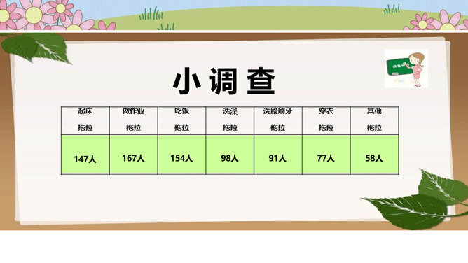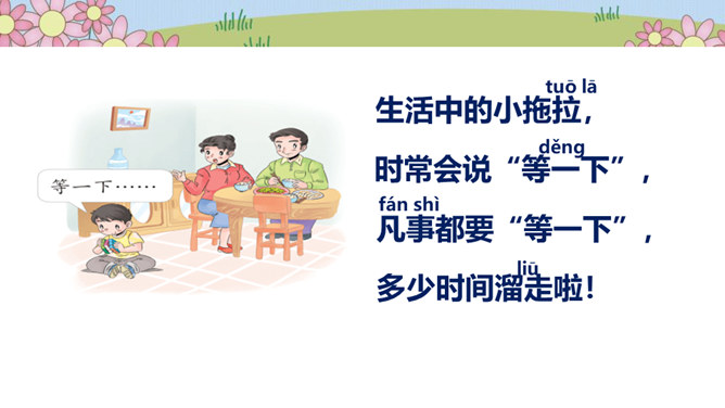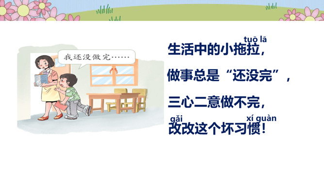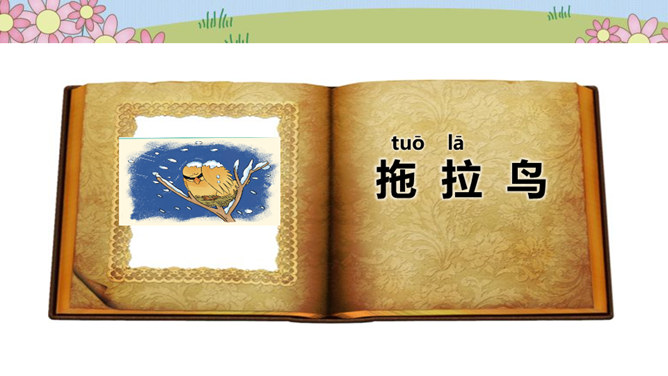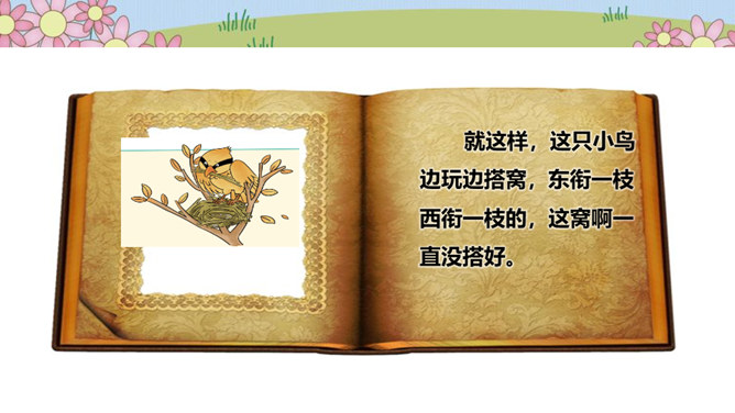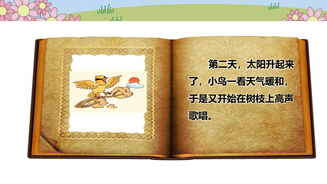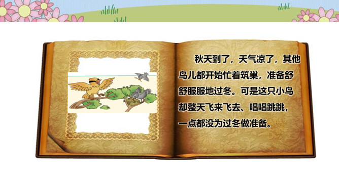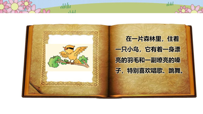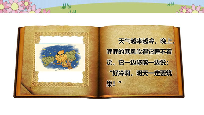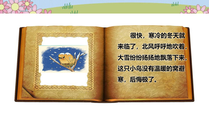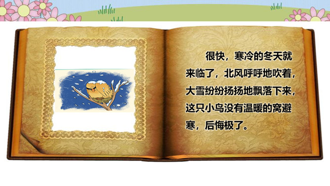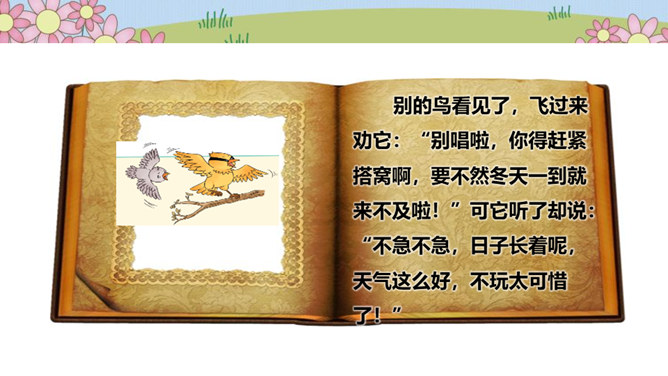 在一片森林里,住着一只小鸟,它有着一身漂亮的羽毛和一副嘹亮的嗓子,特别喜欢唱歌、跳舞。秋天到了,天气凉了,其他鸟儿都开始忙着筑巢,准备舒舒服服地过冬。可是这只小鸟却整天飞来飞去、唱唱跳跳,一点都没为过冬做准备。天气越来越冷,晚上,呼呼的寒风吹得它睡不着觉,它一边哆嗦一边说:“好冷啊,明天一定要筑巢!”第二天,太阳升起来了,小鸟一看天气暖和,于是又开始在树枝上高声歌唱。别的鸟看见了,飞过来劝它:“别唱啦,你得赶紧搭窝啊,要不然冬天一到就来不及啦!”可它听了却说:“不急不急,日子长着呢,天气这么好,不玩太可惜了!”所属专题:我不拖拉ppt。