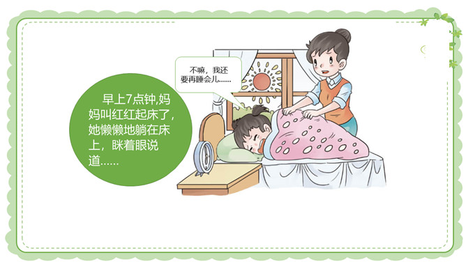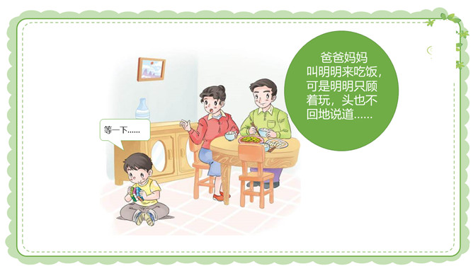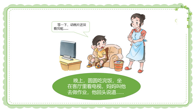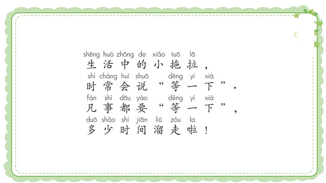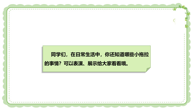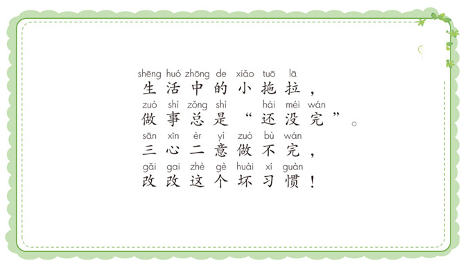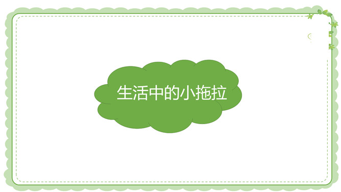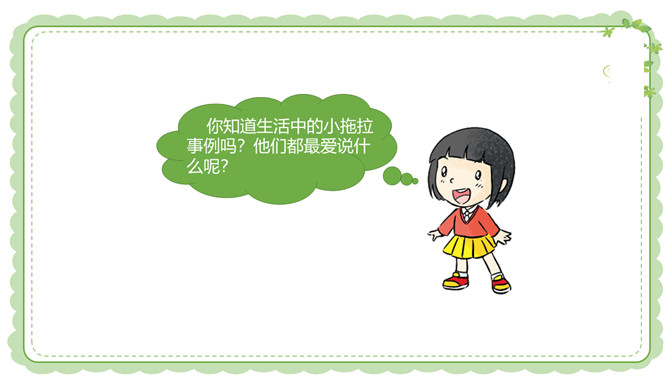 生活中的小拖拉。你知道生活中的小拖拉事例吗?他们都最爱说什么呢?爸爸妈妈叫明明来吃饭,可是明明只顾着玩,头也不回地说道……等一下……早上7点钟,妈妈叫红红起床了,她懒懒地躺在床上,眯着眼说道……不嘛,我还要再睡会儿……晚上,圆圆吃完饭,坐在客厅里看电视,妈妈叫他去做作业,他回头说道……等一下,动画片还没看完呢……周六上午,小刚和同学踢足球,不想回家完成作业,他对同学说道……再玩会儿,作业明天再做。同学们,在日常生活中,你还知道哪些小拖拉的事情?可以表演、展示给大家看看哦。所属专题:我不拖拉ppt。