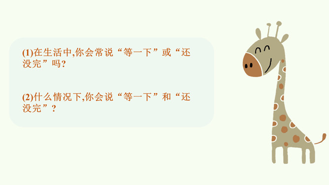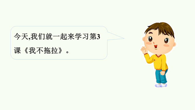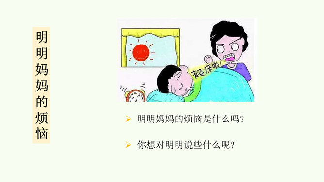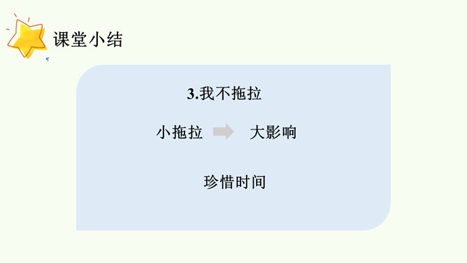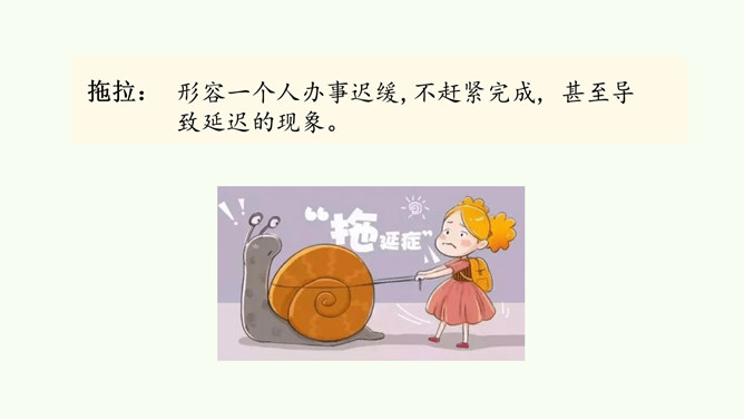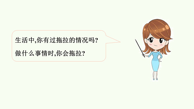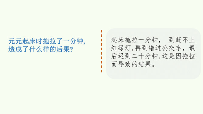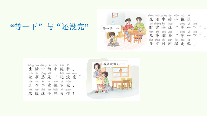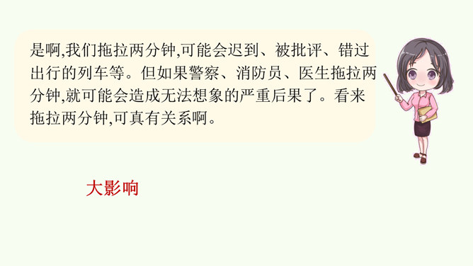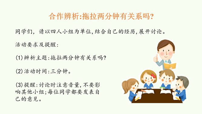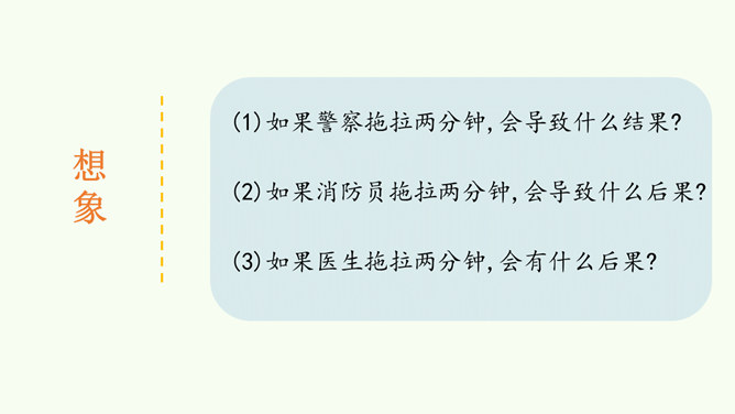 明明妈妈的烦恼是什么吗?你想对明明说些什么呢?(1)在生活中,你会常说“等一下”或“还没完”吗?(2)什么情况下,你会说“等一下”和“还没完”?生活中,你有过拖拉的情况吗?做什么事情时,你会拖拉?元元起床时拖拉了一分钟,造成了什么样的后果?同学们,请以四人小组为单位,结合自己的经历,展开讨论。活动要求及提醒:(1)辨析主题:拖拉两分钟有关系吗?(2)活动时间:三分钟。(3)提醒:讨论时注意音量,不要影响其他小组;每位同学都要发表自己的意见。如果警察、消防员、医生拖拉两分钟,就可能会造成无法想象的严重后果了。所属专题:我不拖拉ppt。