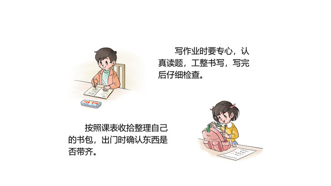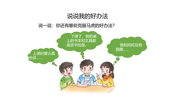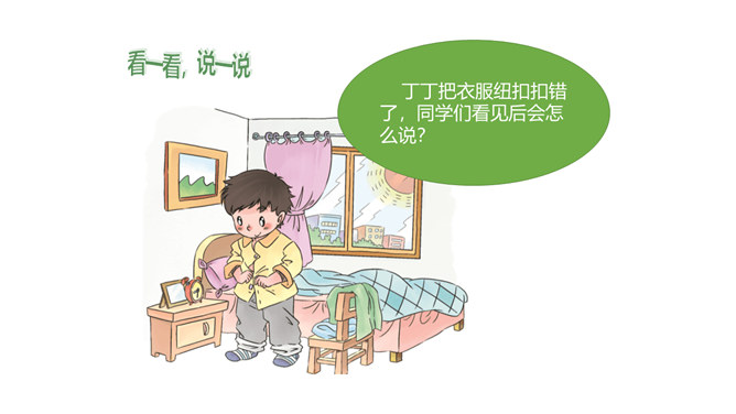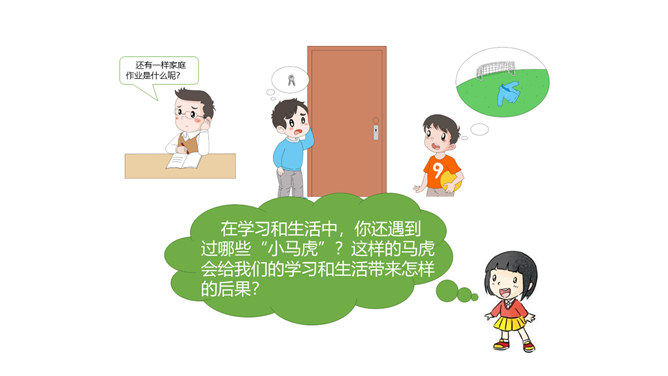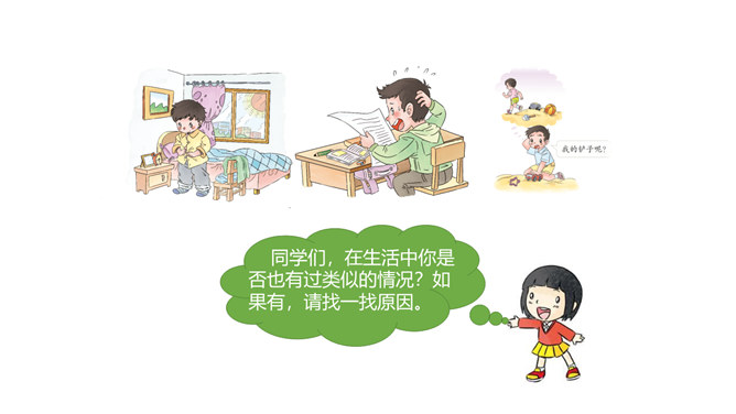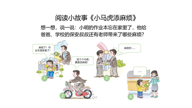 丁丁把衣服纽扣扣错了,同学们看见后会怎么说?猜一猜:东东是因为什么原因把自己的铲子弄丢的?想一想:丢了东西的小主人会遇到哪些麻烦?小华为什么会漏做了一道题呢?同学们,在生活中你是否也有过类似的情况?如果有,请找一找原因。想一想,说一说:小明的作业本忘在家里了,他给爸爸、学校的保安叔叔还有老师带来了哪些麻烦?宁宁,你把“3” 写成“8”了,以后可不能这么马虎了,好吗?在学习和生活中,你还遇到过哪些“小马虎”?这样的马虎会给我们的学习和生活带来怎样的后果?所属专题:不做小马虎ppt。