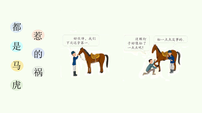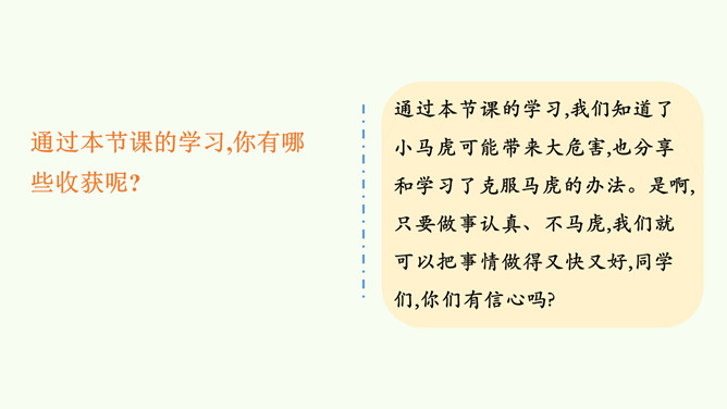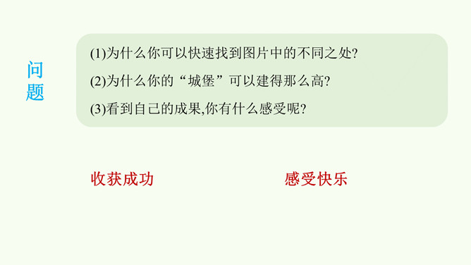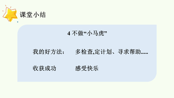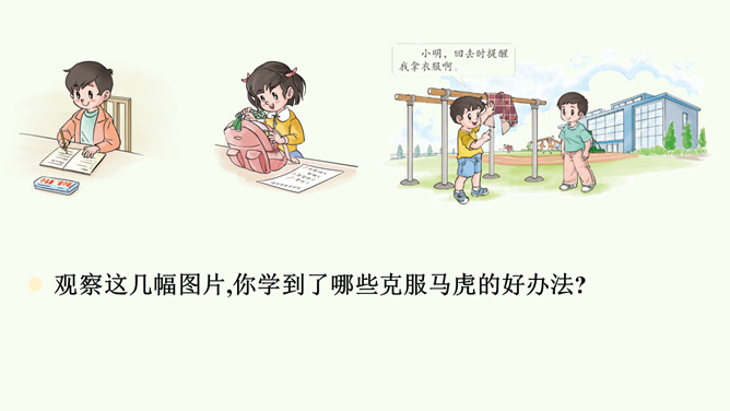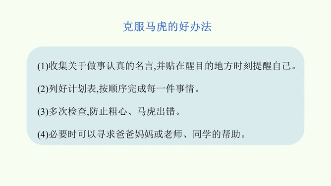 观察这几幅图片,你学到了哪些克服马虎的好办法?克服马虎的好办法:(1)收集关于做事认真的名言,并贴在醒目的地方时刻提醒自己。(2)列好计划表,按顺序完成每一件事情。(3)多次检查,防止粗心、马虎出错。(4)必要时可以寻求爸爸妈妈或老师、同学的帮助。“建大楼”,下发积木, 搭建“高楼”。(1)为什么你可以快速找到图片中的不同之处?(2)为什么你的“城堡”可以建得那么高? 通过本节课的学习,我们知道了小马虎可能带来大危害,也分享和学习了克服马虎的办法。是啊,只要做事认真、不马虎,我们就可以把事情做得又快又好,同学们,你们有信心吗?所属专题:不做小马虎ppt。