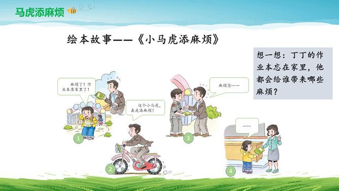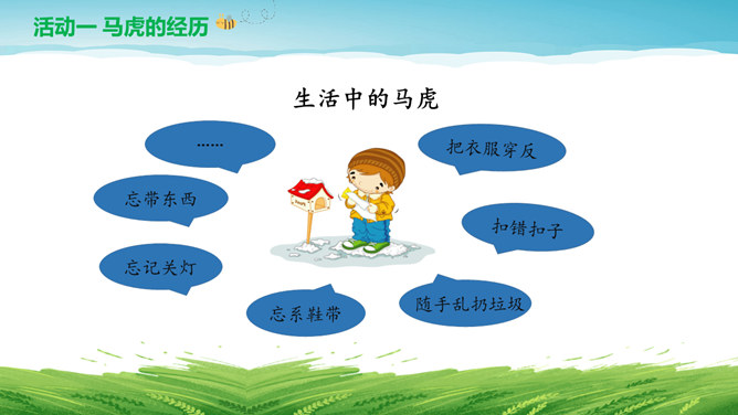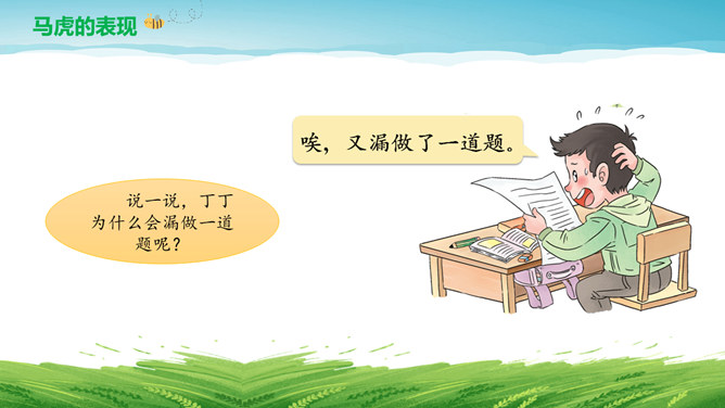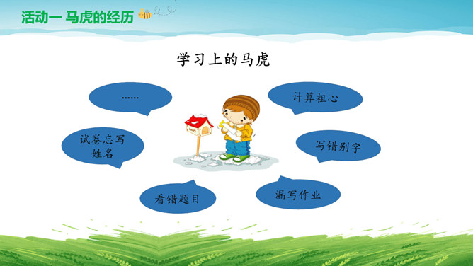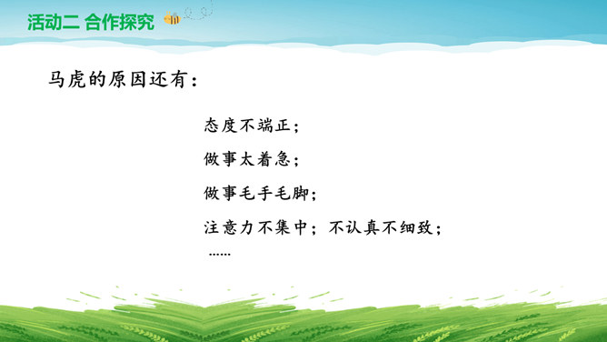 亲爱的同学们:平时的生活学习中我也有马虎的时候,你们可以帮我出出主意,改掉“小马虎”吗?按顺序做题,做完要检查。列清单、任务单。要有责任心。要坚持,有恒心。游戏:大家来找茬。仔细找一找下面两幅图中有哪些地方不同,并思考用什么方法才能把两幅图中不同的地方找全呢?克服马虎有妙招:按顺序、找规律。列清单、有条理。多检查、防遗漏。有困难、寻帮助。所属专题:不做小马虎ppt。