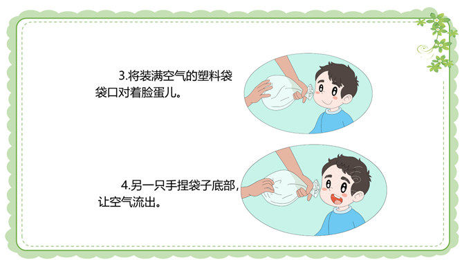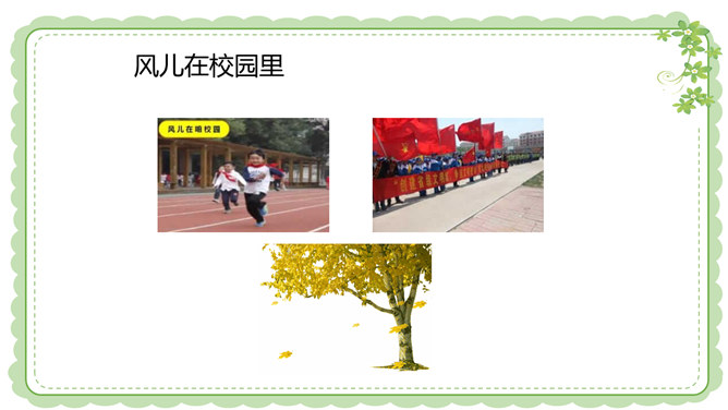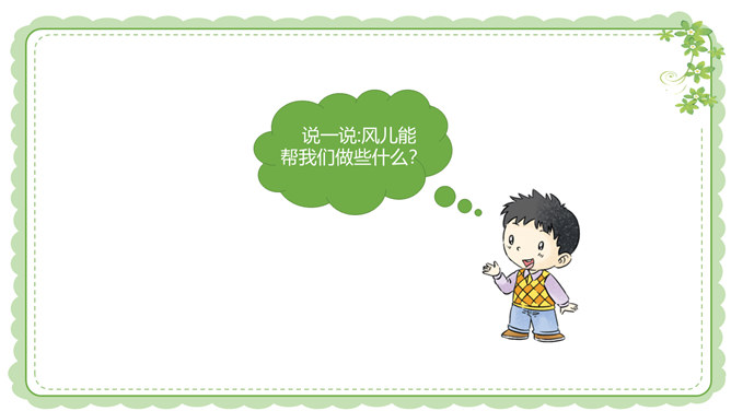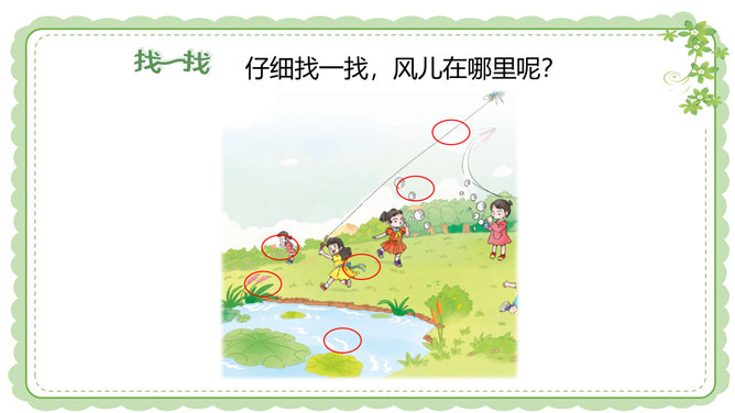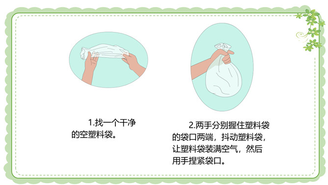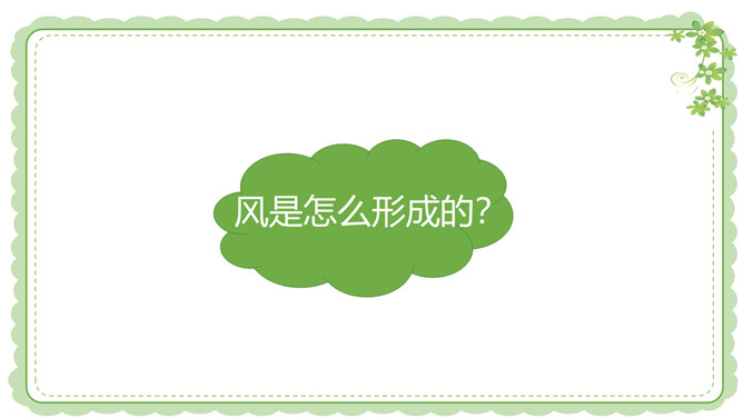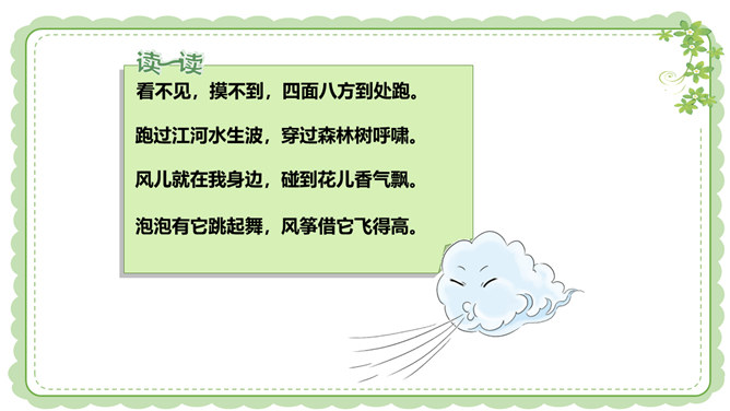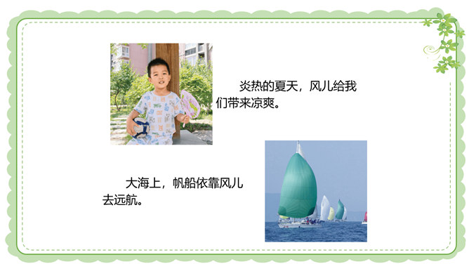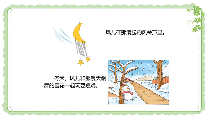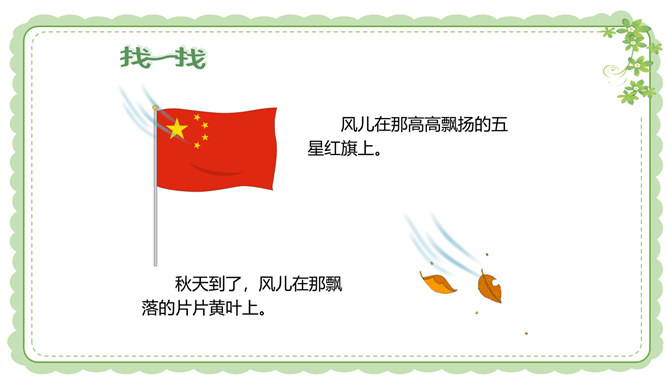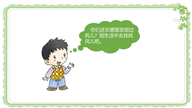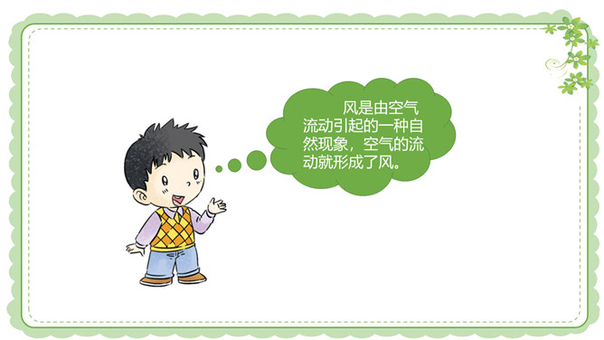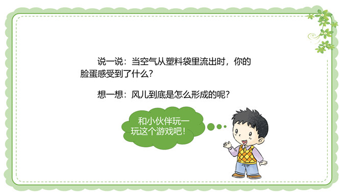 你们还在哪里发现过风儿?到生活中去找找风儿吧。风儿在那高高飘扬的五星红旗上。秋天到了,风儿在那飘落的片片黄叶上。风儿在那清脆的风铃声里。冬天,风儿和那漫天飘舞的雪花一起玩耍嬉戏。风是怎么形成的?1.找一个干净的空塑料袋。2.两手分别握住塑料袋的袋口两端,抖动塑料袋,让塑料袋装满空气,然后用手捏紧袋口。3.将装满空气的塑料袋袋口对着脸蛋儿。4.另一只手捏袋子底部,让空气流出。说一说:当空气从塑料袋里流出时,你的脸蛋感受到了什么?想一想:风儿到底是怎么形成的呢?所属专题:风儿轻轻吹ppt。