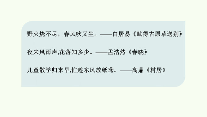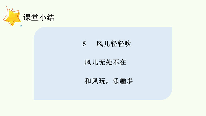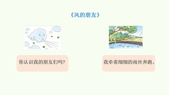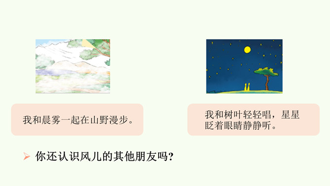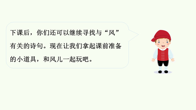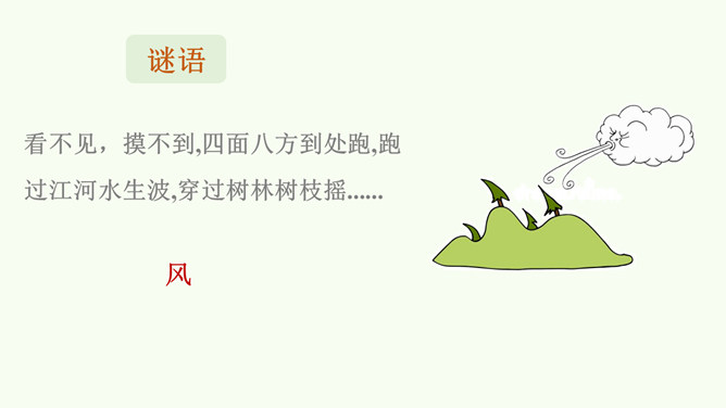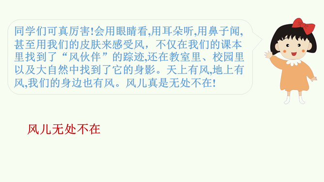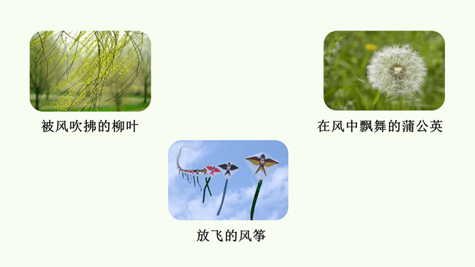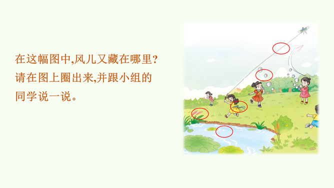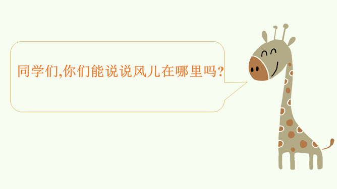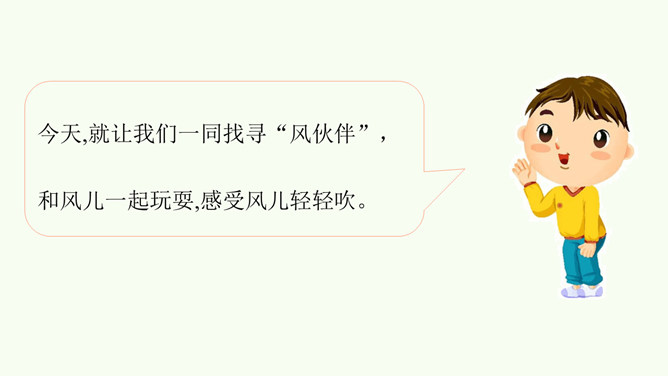 今天,就让我们一同找寻“风伙伴”,和风儿一起玩耍,感受风儿轻轻吹。被风吹拂的柳叶、在风中飘舞的蒲公英、放飞的风筝。同学们,你们能说说风儿在哪里吗?在这幅图中,风儿又藏在哪里?请在图上圈出来,并跟小组的同学说一说。同学们可真厉害!会用眼睛看,用耳朵听,用鼻子闻,甚至用我们的皮肤来感受风,不仅在我们的课本里找到了“风伙伴”的踪迹,还在教室里、校园里以及大自然中找到了它的身影。天上有风,地上有风,我们的身边也有风。风儿真是无处不在!你还认识风儿的其他朋友吗?所属专题:风儿轻轻吹ppt。