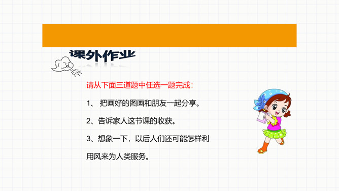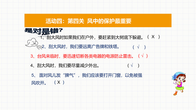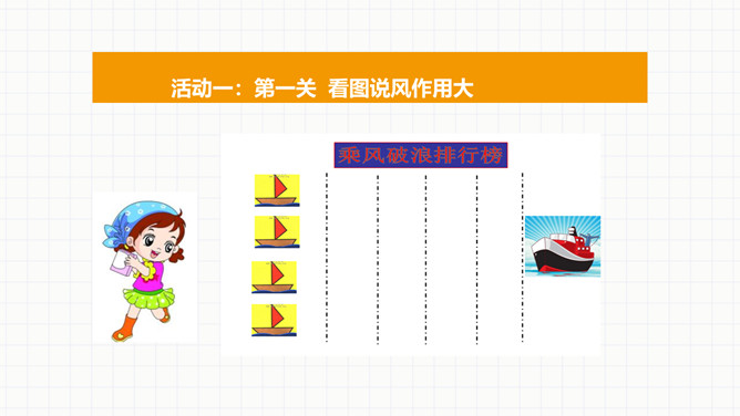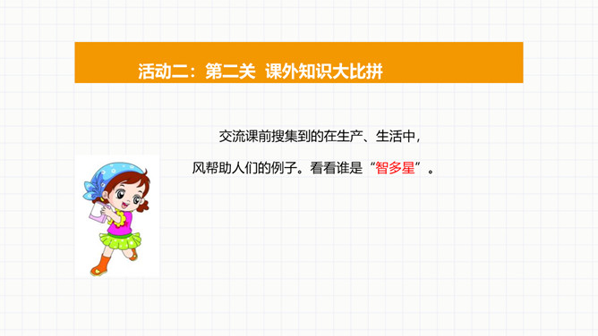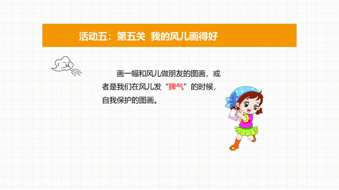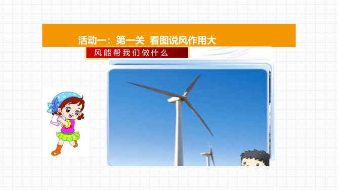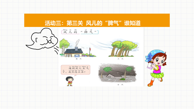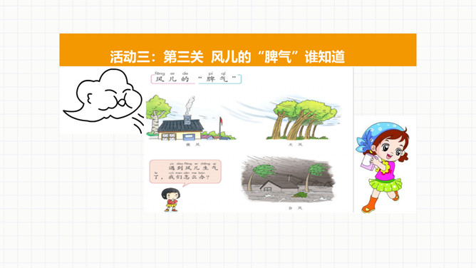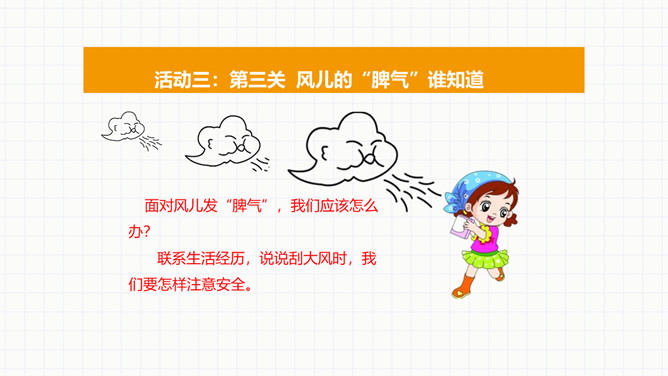 活动一:第一关看图说风作用大。风能帮我们做什么。活动二:第二关课外知识大比拼。交流课前搜集到的在生产、生活中,风帮助人们的例子。看看谁是“智多星”。活动三:第三关风儿的“脾气”谁知道。你喜欢发“脾气”的风儿吗?面对风儿发“脾气”,我们应该怎么办?联系生活经历,说说刮大风时,我们要怎样注意安全。活动四:第四关风中的保护最重要。活动五:第五关我的风儿画得好。画一幅和风儿做朋友的图画,或者是我们在风儿发“脾气”的时候,自我保护的图画。所属专题:风儿轻轻吹ppt。
