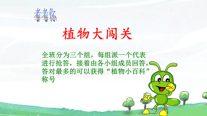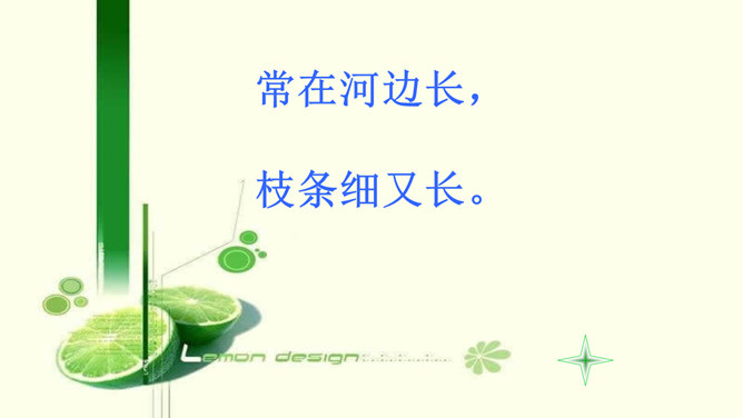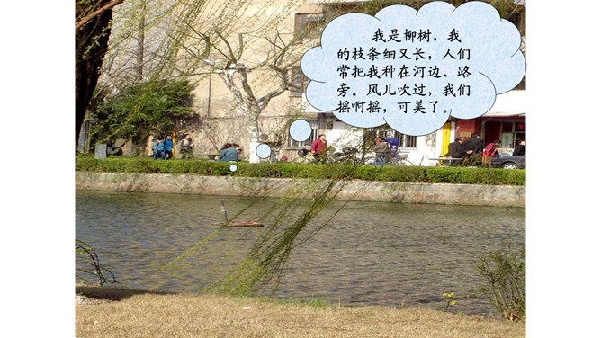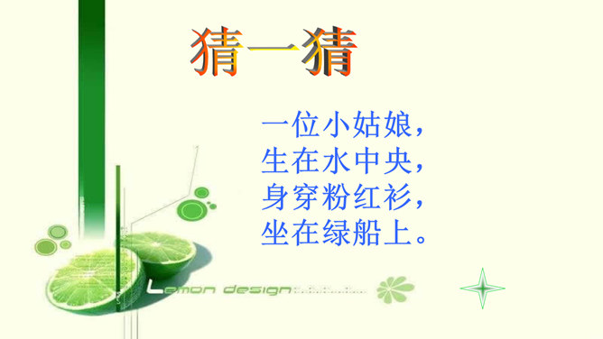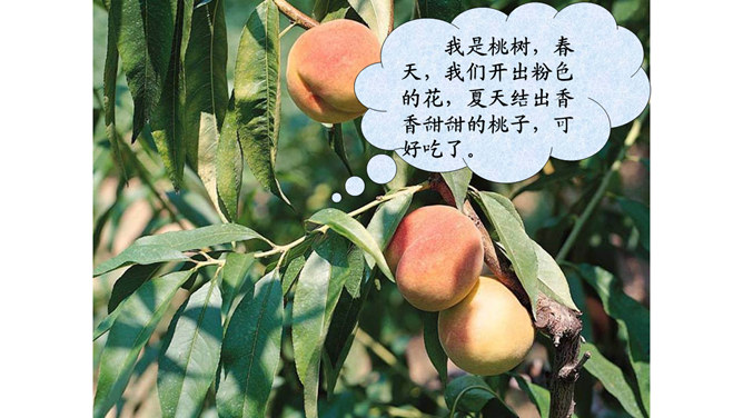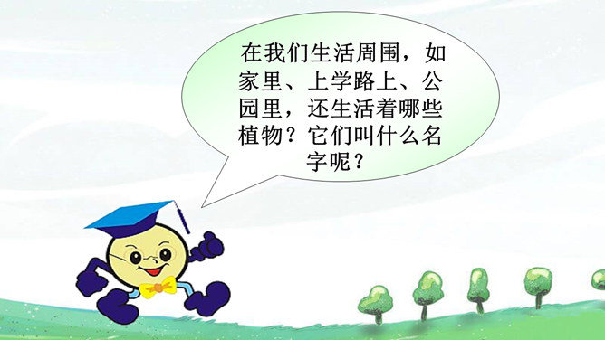 猜一猜:一位小姑娘,生在水中央,身穿粉红衫,坐在绿船上。常在河边长,枝条细又长。在我们生活周围,如家里、上学路上、公园里,还生活着哪些植物?它们叫什么名字呢?植物大闯关:全班分为三个组,每组派一个代表进行抢答,接着由各小组成员回答,答对最多的可以获得“植物小百科”称号。我是柳树,我的枝条细又长,人们常把我种在河边、路旁。风儿吹过,我们摇啊摇,可美了。我是桃树,春天,我们开出粉色的花,夏天结出香香甜甜的桃子,可好吃了。所属专题:花儿草儿真美丽ppt。