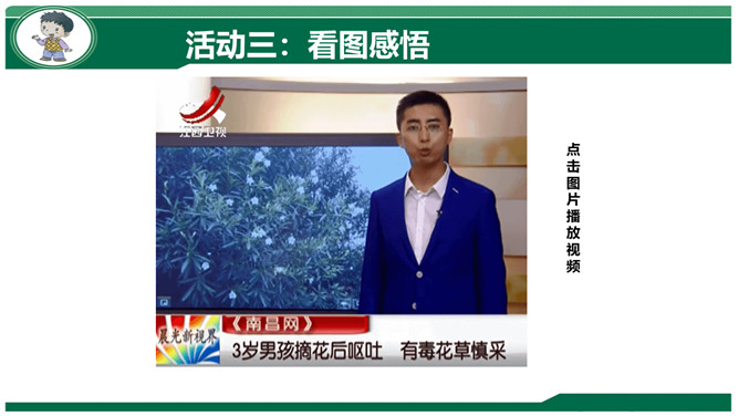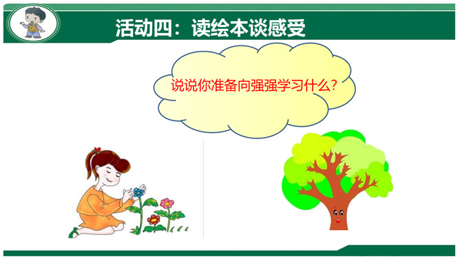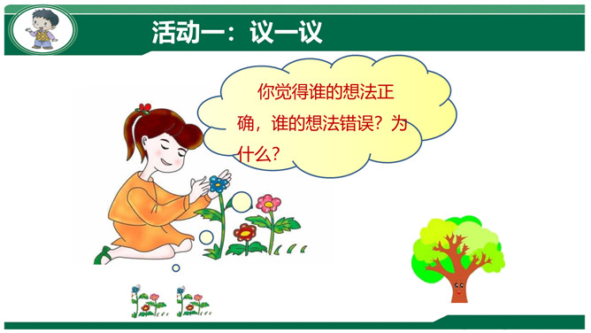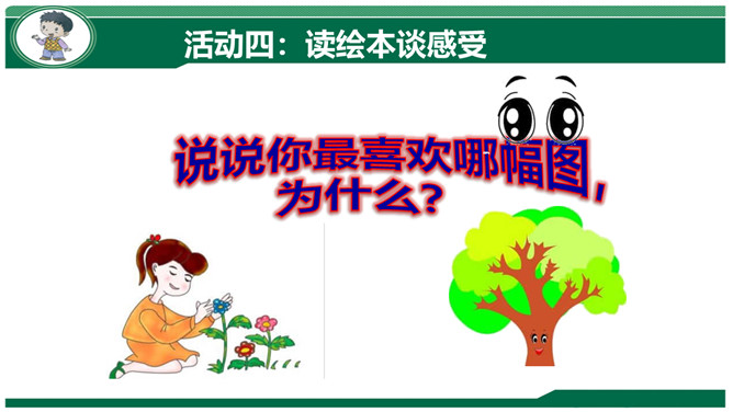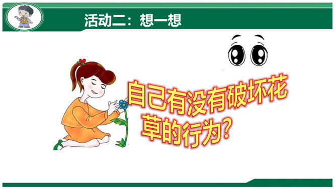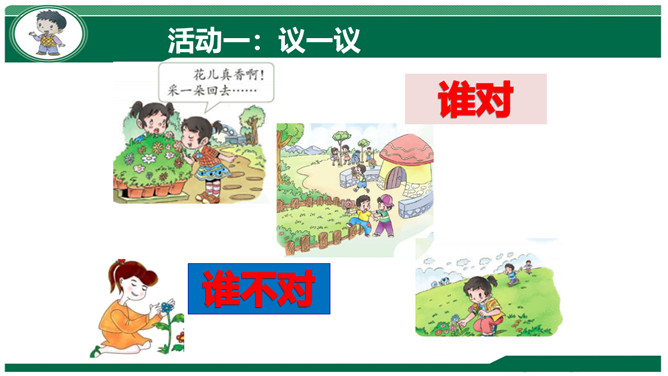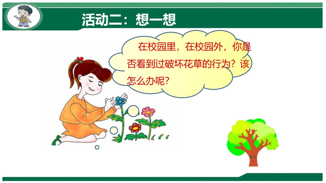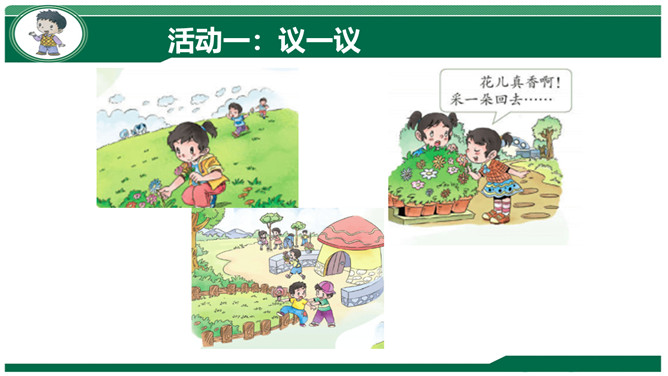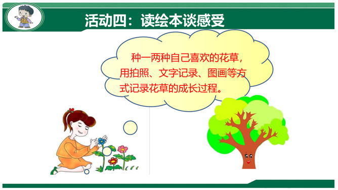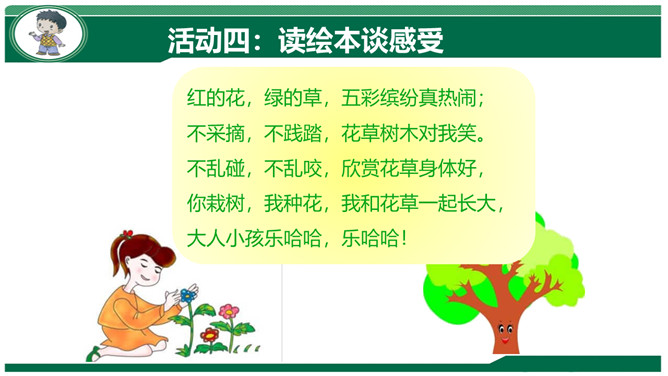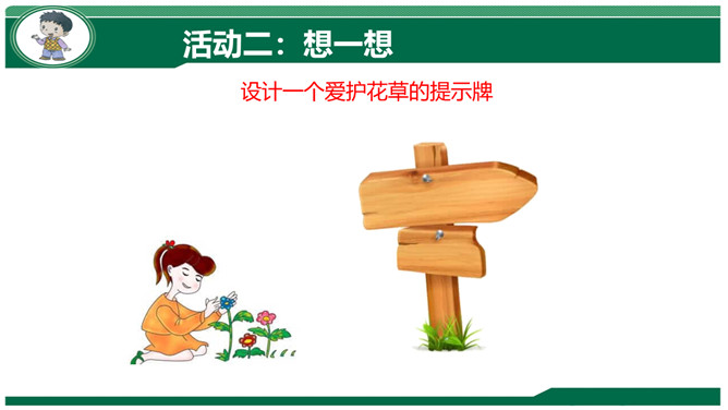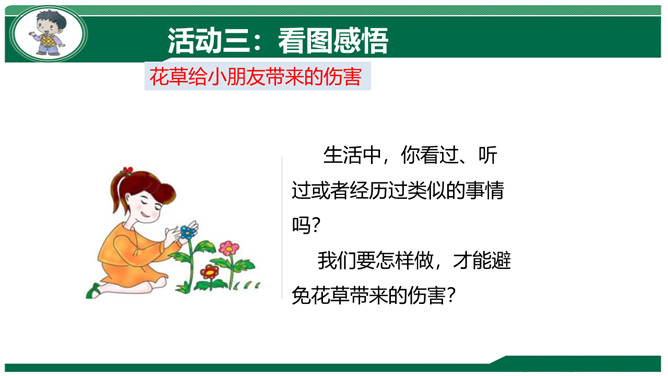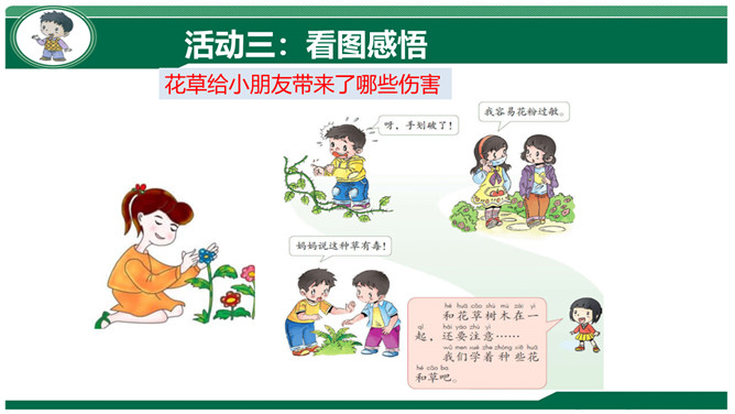活动一:议一议。你觉得谁的想法正确,谁的想法错误?为什么?活动二:想一想。在校园里,在校园外,你是否看到过破坏花草的行为?该怎么办呢?自己有没有破坏花草的行为?设计一个爱护花草的提示牌。活动三:看图感悟。花草给小朋友带来了哪些伤害。生活中,你看过、听过或者经历过类似的事情吗?我们要怎样做,才能避免花草带来的伤害?活动四:读绘本谈感受。说说你最喜欢哪幅图,为什么?说说你准备向强强学习什么?种一两种自己喜欢的花草,用拍照、文字记录、图画等方式记录花草的成长过程。所属专题:花儿草儿真美丽ppt。