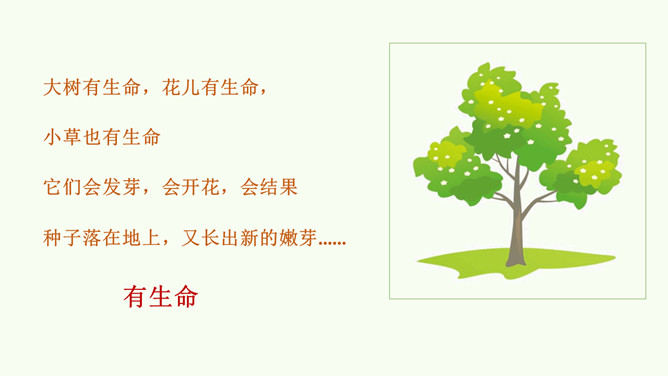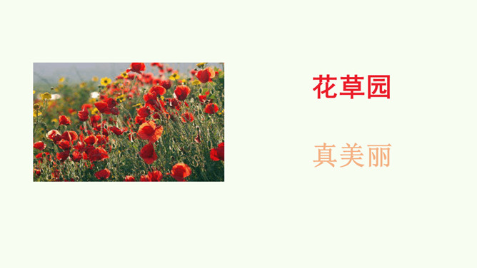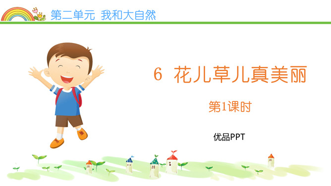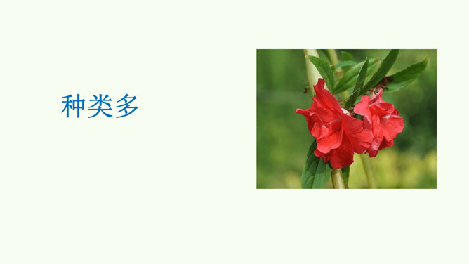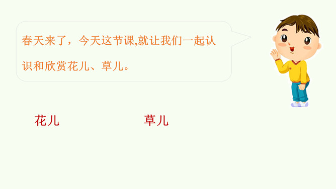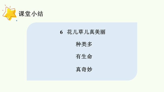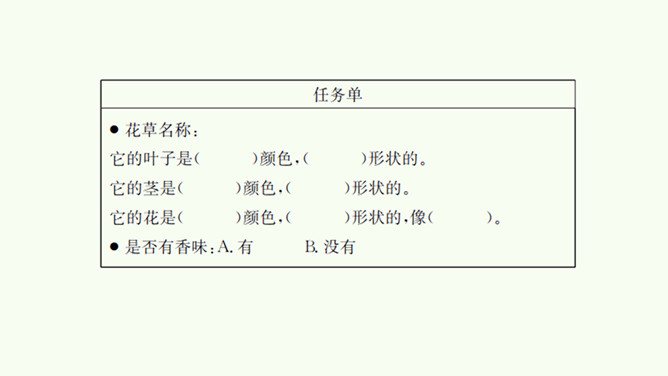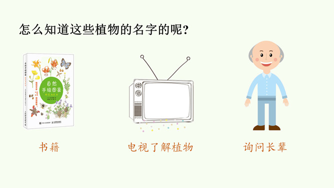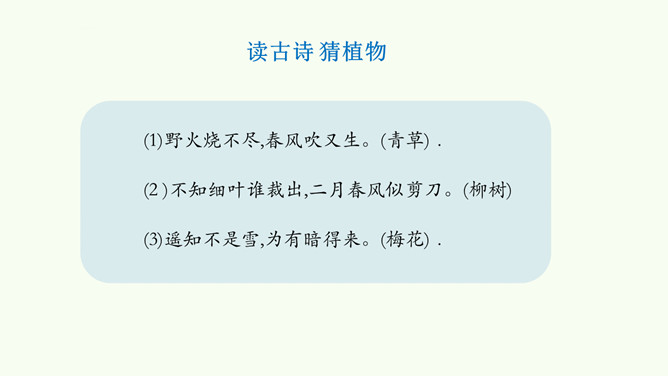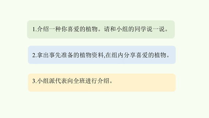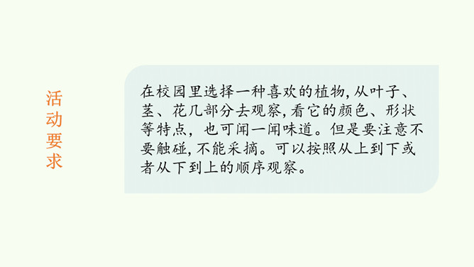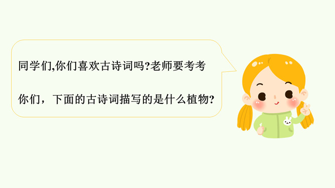 同学们,你们喜欢古诗词吗?老师要考考你们,下面的古诗词描写的是什么植物?春天来了,今天这节课,就让我们一起认识和欣赏花儿、草儿。怎么知道这些植物的名字的呢?1.介绍一种你喜爱的植物。请和小组的同学说一说。2.拿出事先准备的植物资料,在组内分享喜爱的植物。3.小组派代表向全班进行介绍。在校园里选择一种喜欢的植物,从叶子、茎、花几部分去观察,看它的颜色、形状等特点,也可闻一闻味道。但是要注意不要触碰,不能采摘。可以按照从上到下或者从下到上的顺序观察。所属专题:花儿草儿真美丽ppt。