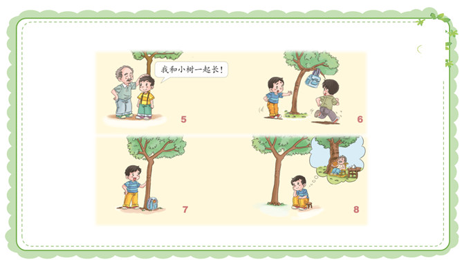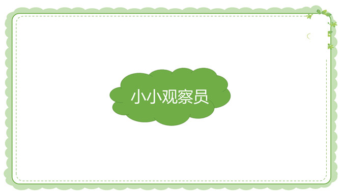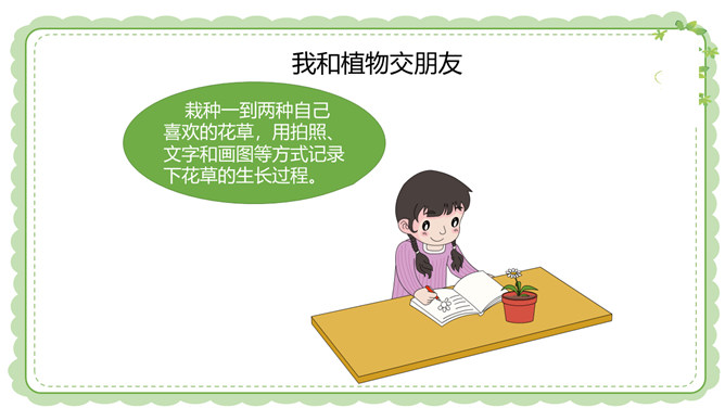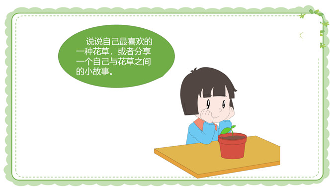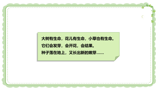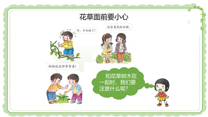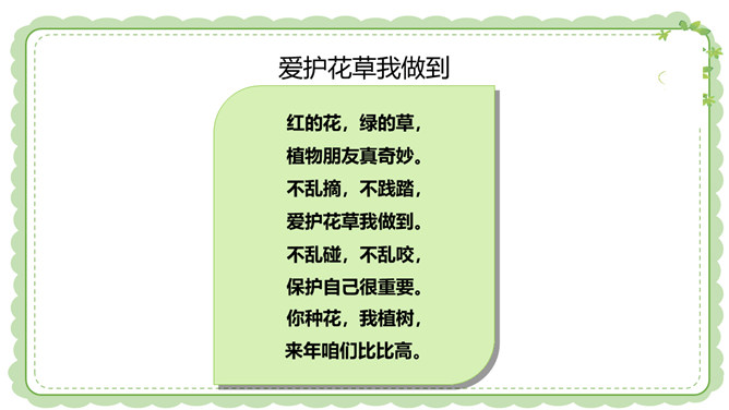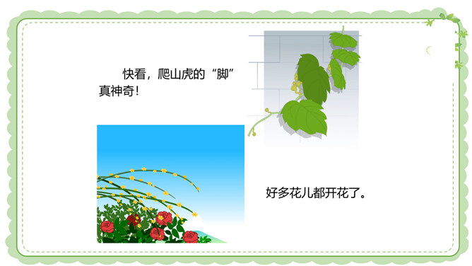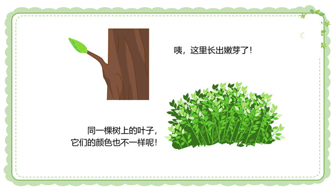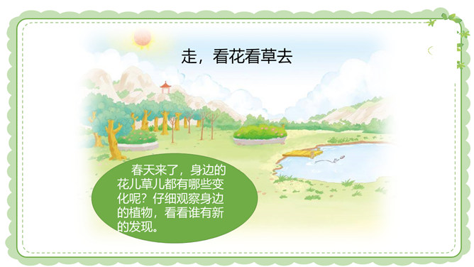 走,看花看草去。春天来了,身边的花儿草儿都有哪些变化呢?仔细观察身边的植物,看看谁有新的发现。说说你的发现。咦,这里长出嫩芽了!同一棵树上的叶子,它们的颜色也不一样呢!快看,爬山虎的“脚”真神奇!好多花儿都开花了。大树有生命,花儿有生命,小草也有生命。它们会发芽,会开花,会结果。种子落在地上,又长出新的嫩芽……说说自己最喜欢的一种花草,或者分享一个自己与花草之间的小故事。和花草树木在一起时,我们要注意什么呢?栽种一到两种自己喜欢的花草,用拍照、文字和画图等方式记录下花草的生长过程。所属专题:花儿草儿真美丽ppt。