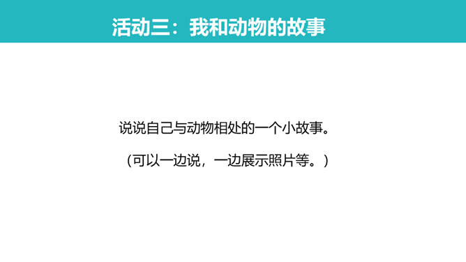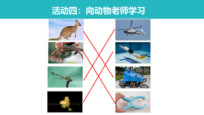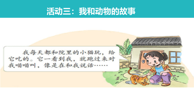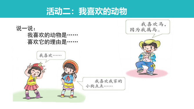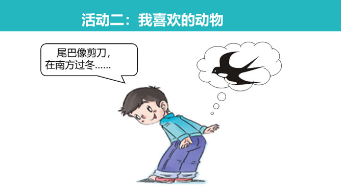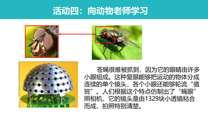 活动一:我们和谐相处。活动二:我喜欢的动物。尾巴像剪刀,在南方过冬……说一说:我喜欢的动物是……喜欢它的理由是……活动三:我和动物的故事。说说自己与动物相处的一个小故事。(可以一边说,一边展示照片等。)活动四:向动物老师学习。苍蝇很难被抓到,因为它的眼睛由许多小眼组成。这种复眼能够把运动的物体分成连续的单个镜头,各个小眼还能够轮流“值班”。人们根据这个特点仿制出了“蝇眼”照相机,它的镜头是由1329块小透镜粘合而成,拍照特别清楚。所属专题:可爱的动物ppt。