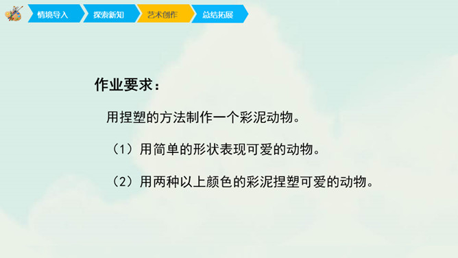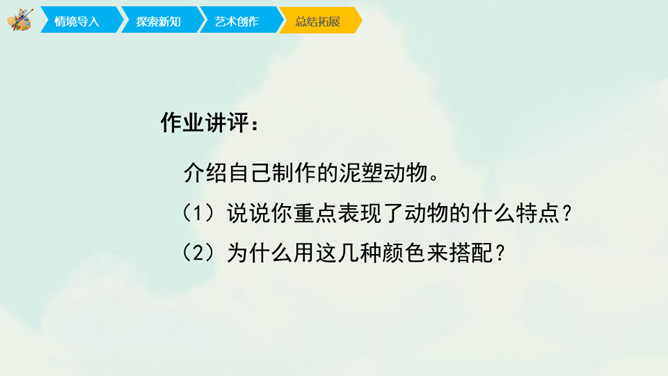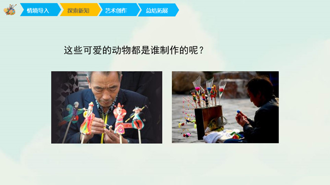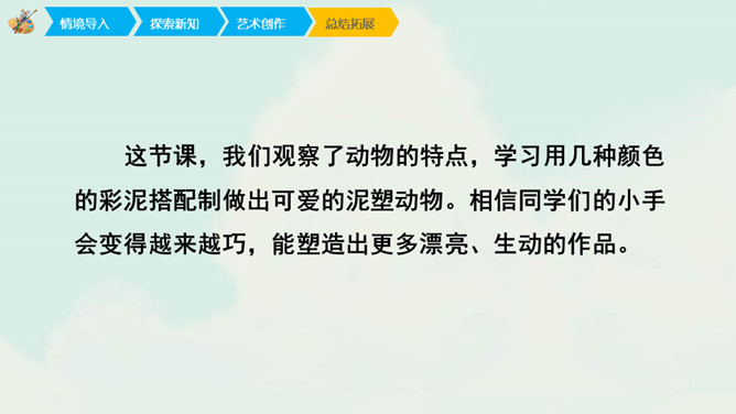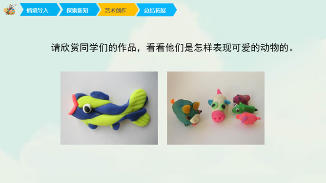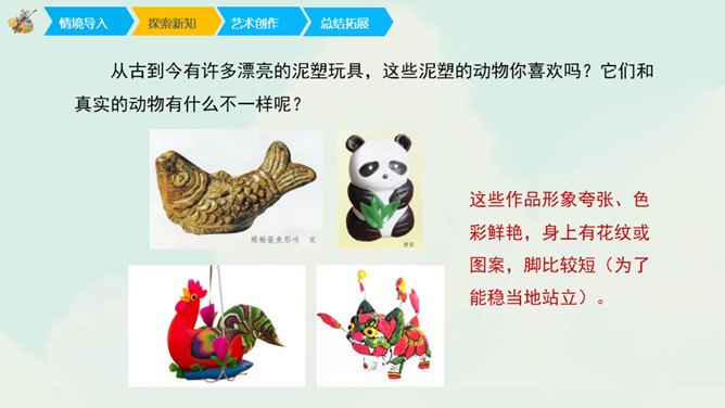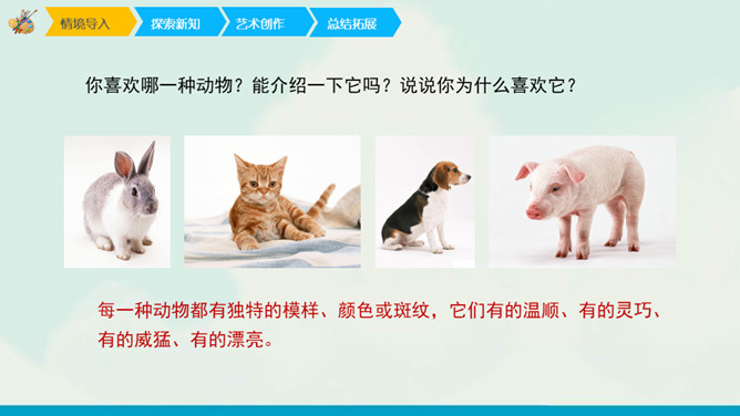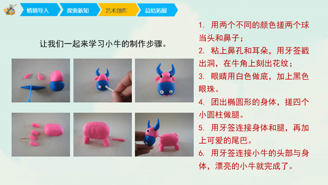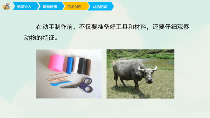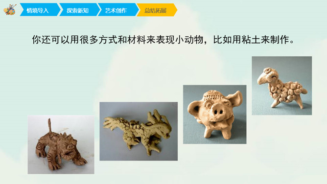 你喜欢哪一种动物?能介绍一下它吗?说说你为什么喜欢它?每一种动物都有独特的模样、颜色或斑纹,它们有的温顺、有的灵巧、有的威猛、有的漂亮。从古到今有许多漂亮的泥塑玩具,这些泥塑的动物你喜欢吗?它们和真实的动物有什么不一样呢?这些作品形象夸张、色彩鲜艳,身上有花纹或图案,脚比较短(为了能稳当地站立)。这些可爱的动物都是谁制作的呢?在动手制作前,不仅要准备好工具和材料,还要仔细观察动物的特征。让我们一起来学习小牛的制作步骤。所属专题:可爱的动物ppt。