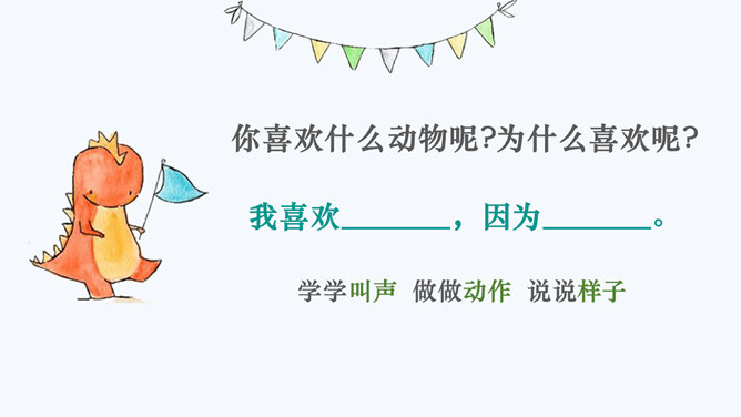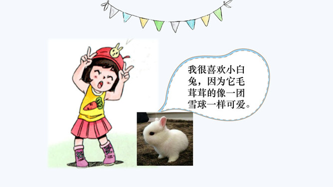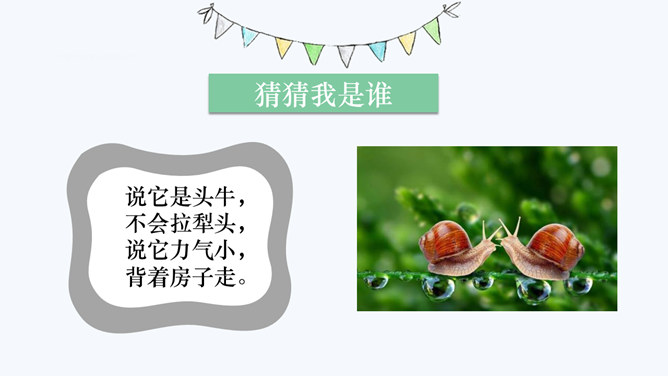 猜猜我是谁?说它是头牛,不会拉犁头,说它力气小,背着房子走。地球上的动物约有150万种。我喜欢马,因为我属马。你喜欢什么动物呢?为什么喜欢呢?我很喜欢小白兔,因为它毛茸茸的像一团雪球一样可爱。什么尾巴像剪刀,在南方过冬呢?我喜欢我家的小狗点点,因为它总是陪着我,是我的好朋友。我的好朋友名叫团团,我每天都和它玩耍,给它吃的,它一看到我,就跑过来对我喵喵叫,像是在和我说话。你和你的动物朋友之间都发生过什么故事呢?动物们和我们人一样,也有感情,也懂得爱,给我们带来了无尽的温暖和感动。所属专题:可爱的动物ppt。