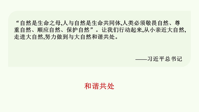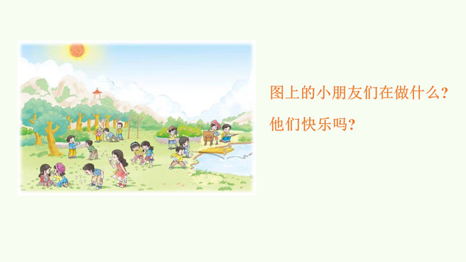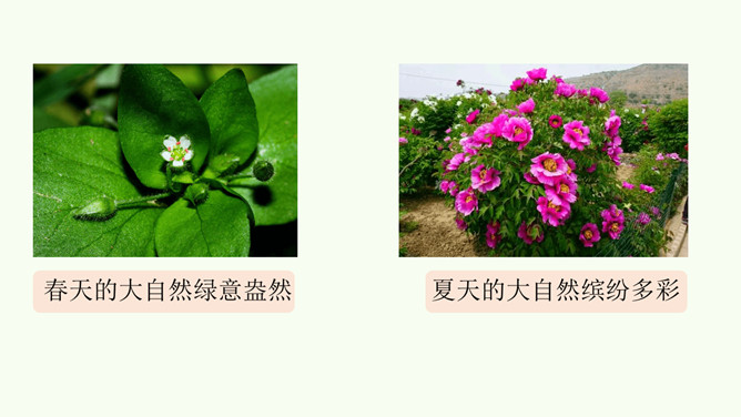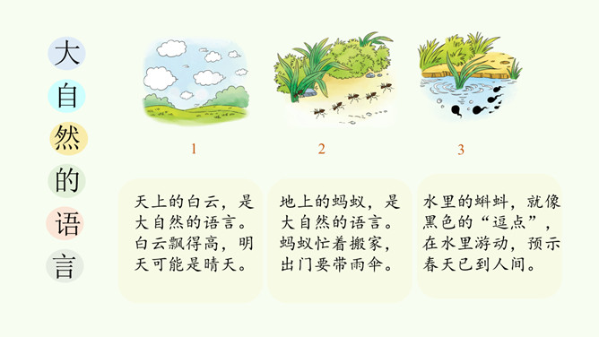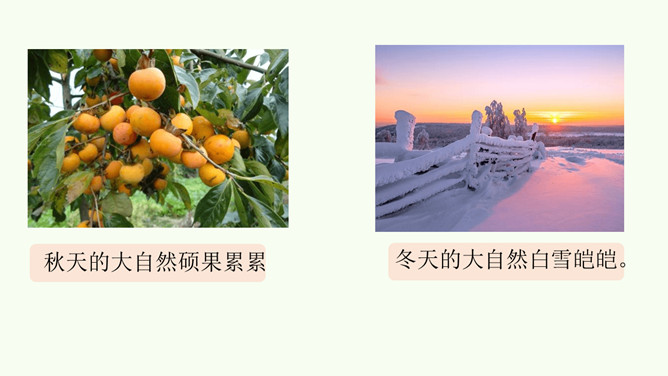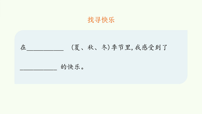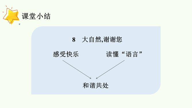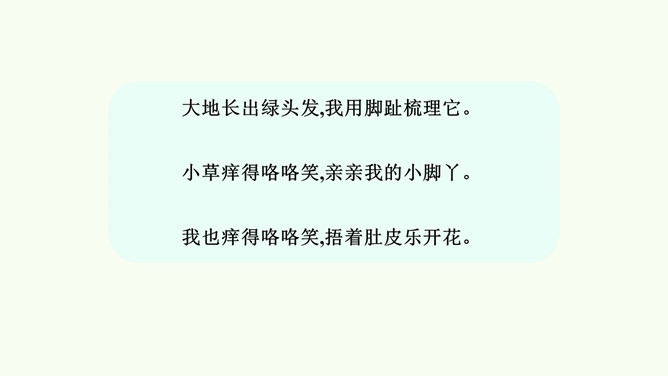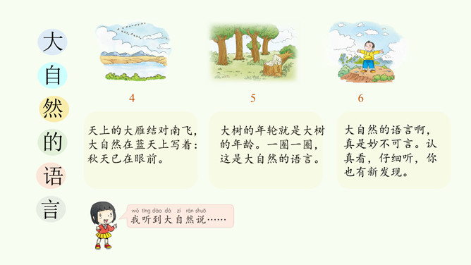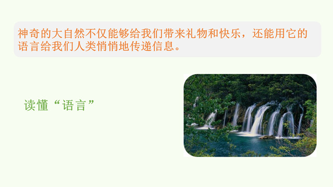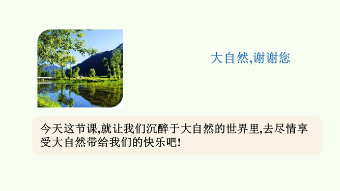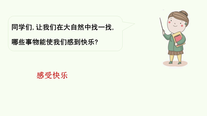 今天这节课,就让我们沉醉于大自然的世界里,去尽情享受大自然带给我们的快乐吧!同学们,让我们在大自然中找一找,哪些事物能使我们感到快乐?图上的小朋友们在做什么?他们快乐吗?大地长出绿头发,我用脚趾梳理它。小草痒得咯咯笑,亲亲我的小脚丫。我也痒得咯咯笑,捂着肚皮乐开花。春天的大自然绿意盎然。夏天的大自然缤纷多彩。秋天的大自然硕果累累。冬天的大自然白雪皑皑。神奇的大自然不仅能够给我们带来礼物和快乐,还能用它的语言给我们人类悄悄地传递信息。所属专题:大自然谢谢您ppt。