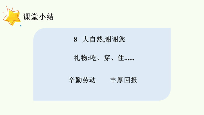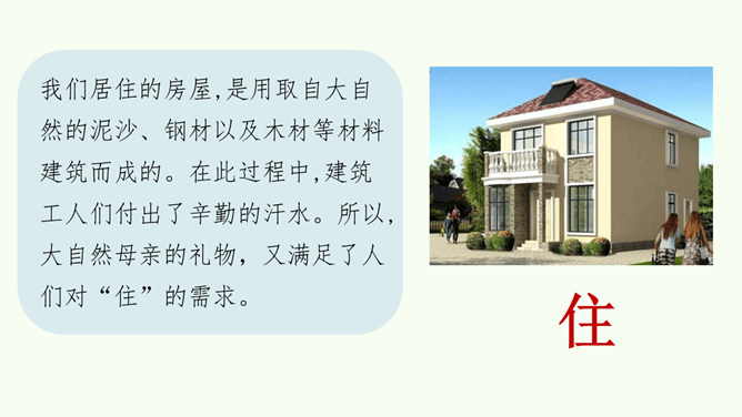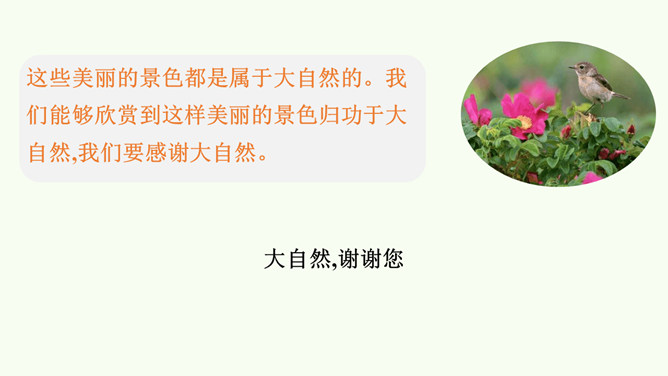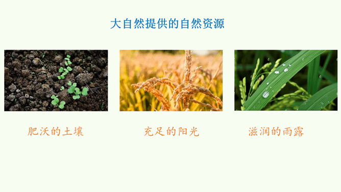 同学们,让我们一同来欣赏大自然的风景吧!这些美丽的景色都是属于大自然的。我们能够欣赏到这样美丽的景色归功于大自然,我们要感谢大自然。水稻的成长离不开什么呢?我们居住的房屋,是用取自大自然的泥沙、钢材以及木材等材料建筑而成的。在此过程中,建筑工人们付出了辛勤的汗水。所以,大自然母亲的礼物,又满足了人们对“住”的需求。所属专题:大自然谢谢您ppt。