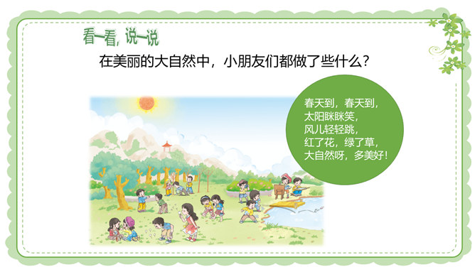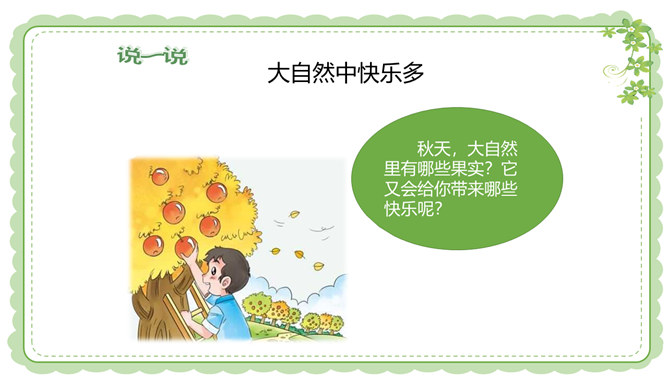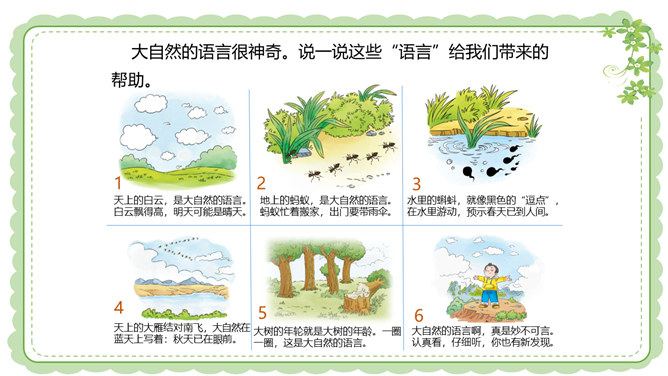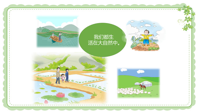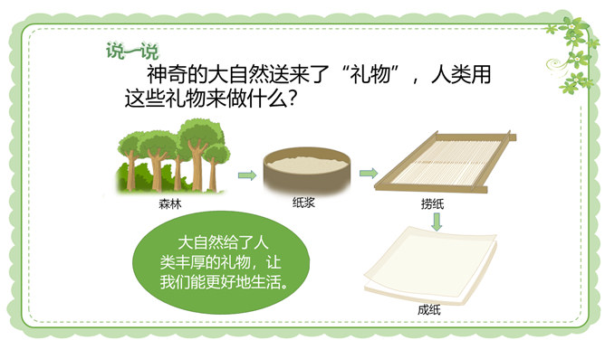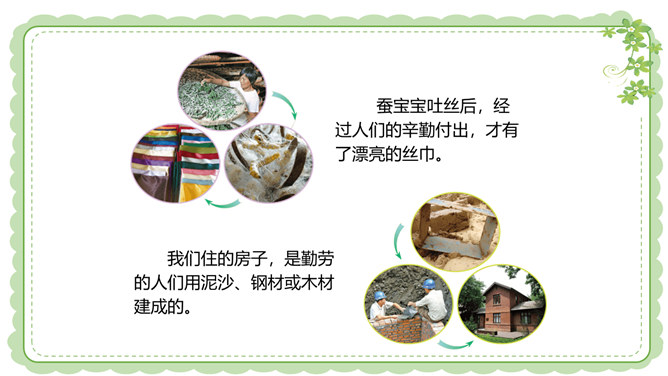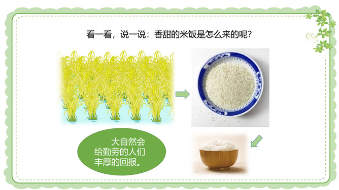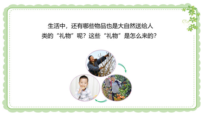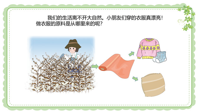 我们都生活在大自然中。我们的生活离不开大自然。小朋友们穿的衣服真漂亮!做衣服的原料是从哪里来的呢?看一看,说一说:香甜的米饭是怎么来的呢?大自然会给勤劳的人们丰厚的回报。神奇的大自然送来了“礼物”,人类用这些礼物来做什么?大自然给了人类丰厚的礼物,让我们能更好地生活。蚕宝宝吐丝后,经过人们的辛勤付出,才有了漂亮的丝巾。我们住的房子,是勤劳的人们用泥沙、钢材或木材建成的。生活中,还有哪些物品也是大自然送给人类的“礼物”呢?这些“礼物”是怎么来的?所属专题:大自然谢谢您ppt。