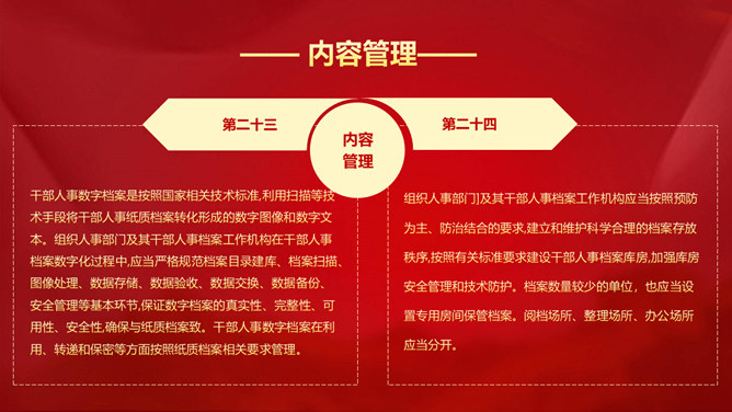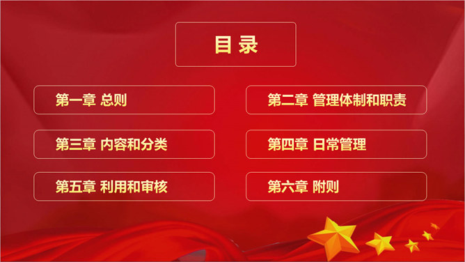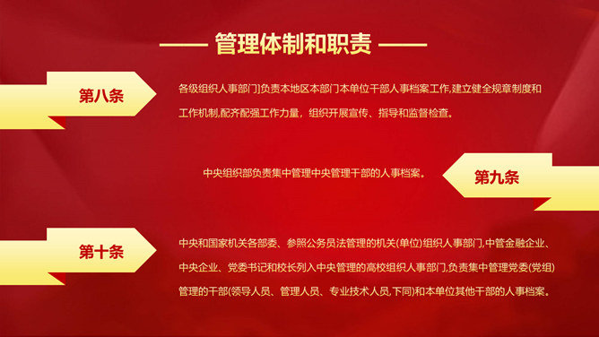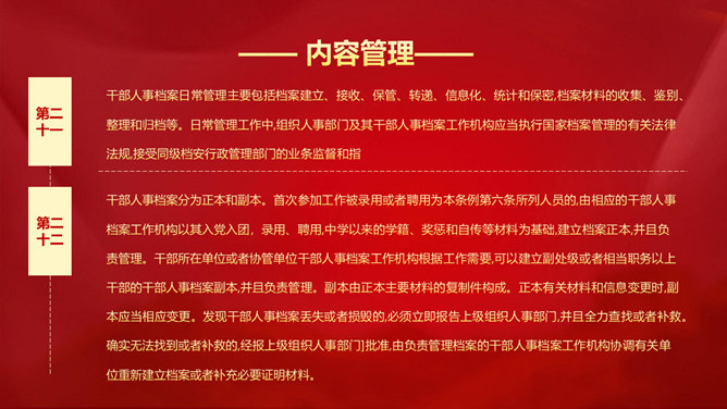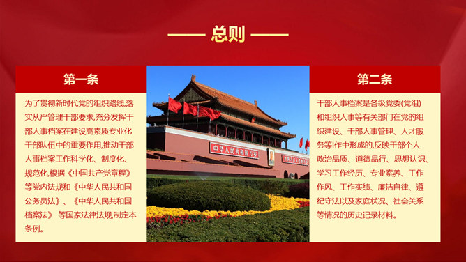 干部人事档案工作条例PPT模板。第一章 总则、第二章 管理体制和职责、第三章 内容和分类、第四章 日常管理、第五章 利用和审核、第六章 附则。