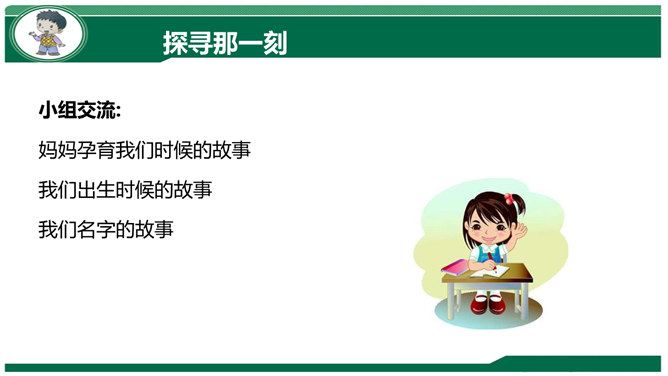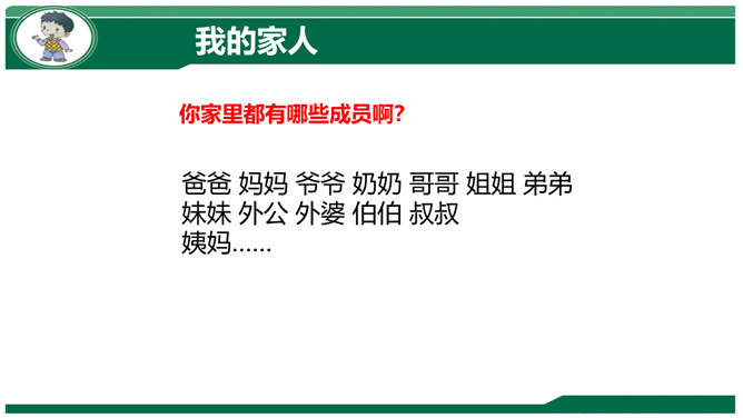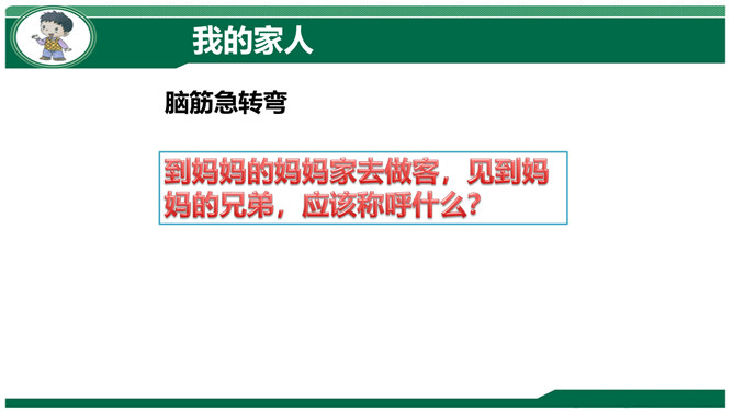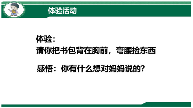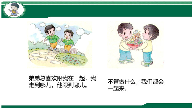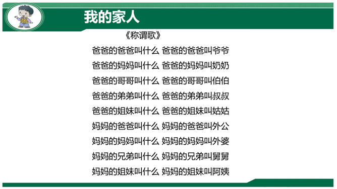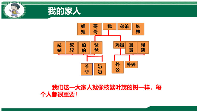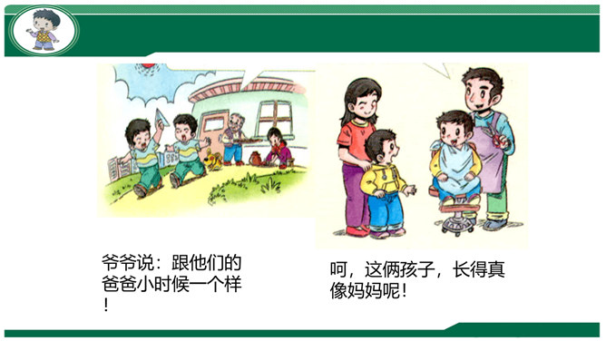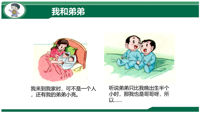小组交流:妈妈孕育我们时候的故事。我们出生时候的故事。我们名字的故事。体验:请你把书包背在胸前,弯腰捡东西。感悟:你有什么想对妈妈说的?到妈妈的妈妈家去做客,见到妈妈的兄弟,应该称呼什么?我们这一大家人就像枝繁叶茂的树一样,每个人都很重要!我来到我家时,可不是一个人,还有我的弟弟小亮。听说弟弟只比我晚出生半个小时,那我也是哥哥呀,所以……弟弟总喜欢跟我在一起,我走到哪儿,他跟到哪儿。不管做什么,我们都会一起来。爷爷说:跟他们的爸爸小时候一个样!所属专题:我和我的家ppt。