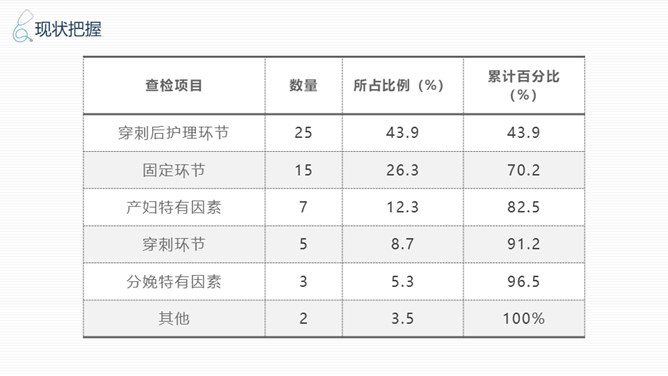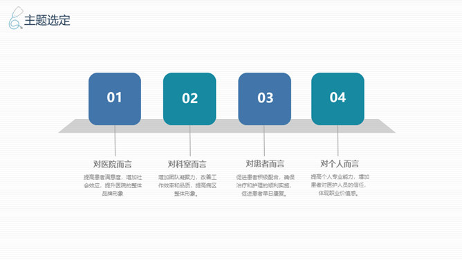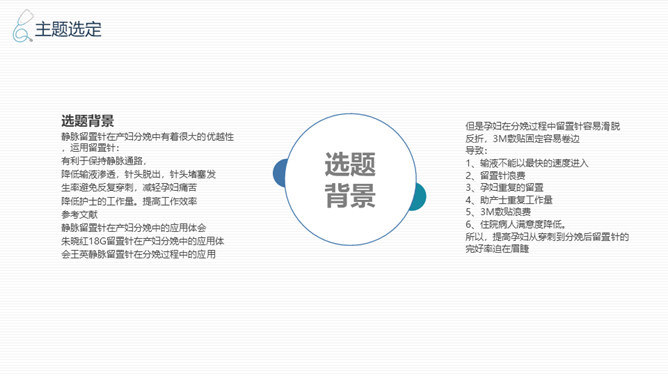 品管圈医疗QC幻灯片模板。包括成员介绍、主题选定、计划拟定、现状把握、目标设定、原因分析、对策实施、效果确认、标准化、总结。