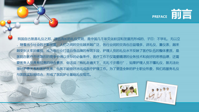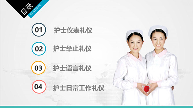 护士护理礼仪培训PPT模板。护理人员的礼仪水平反映了医疗队伍的整体素质,是医院在医疗市场激烈的竞争中得以生存的必备条件。