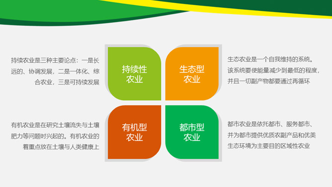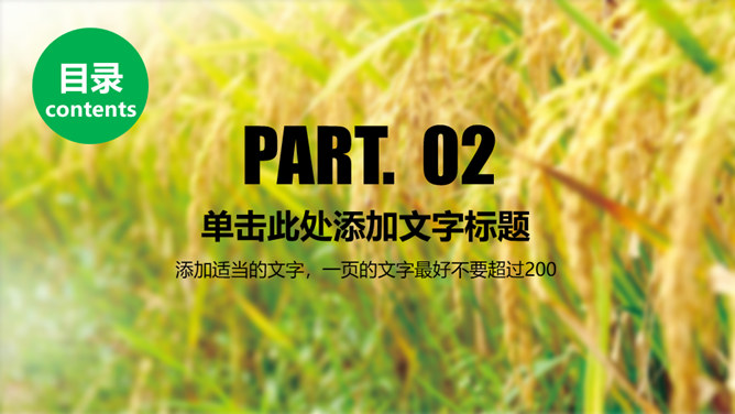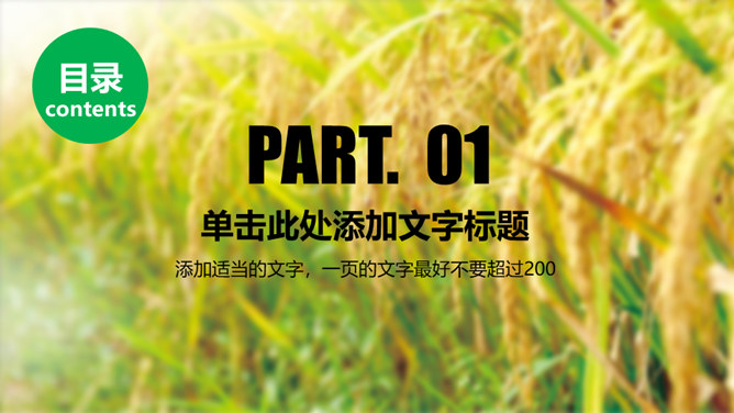 水稻玉米农业农产品PPT模板。一套农业主题幻灯片模板,水稻、玉米等农产品背景,适合现代农业种植等主题。