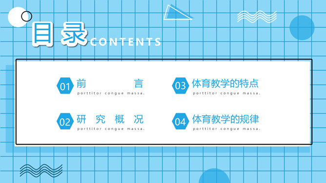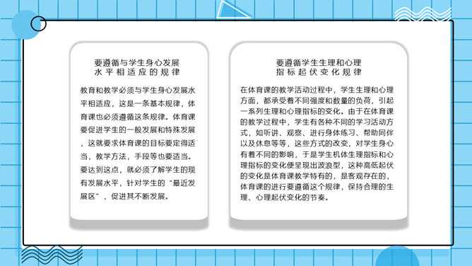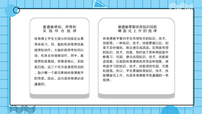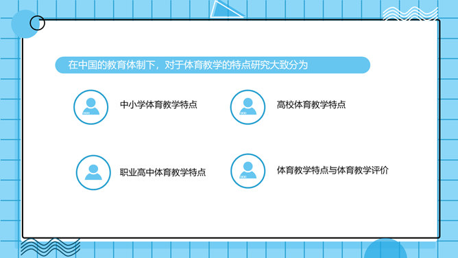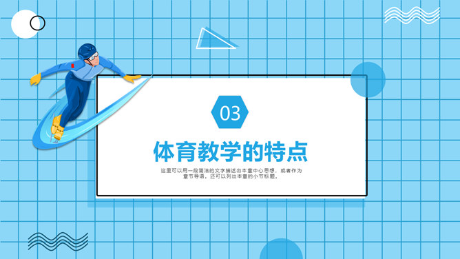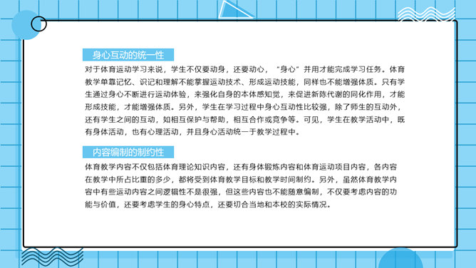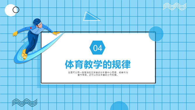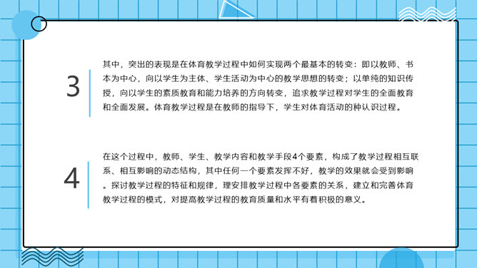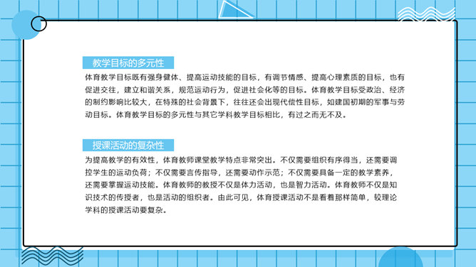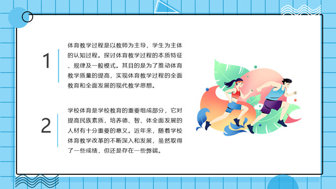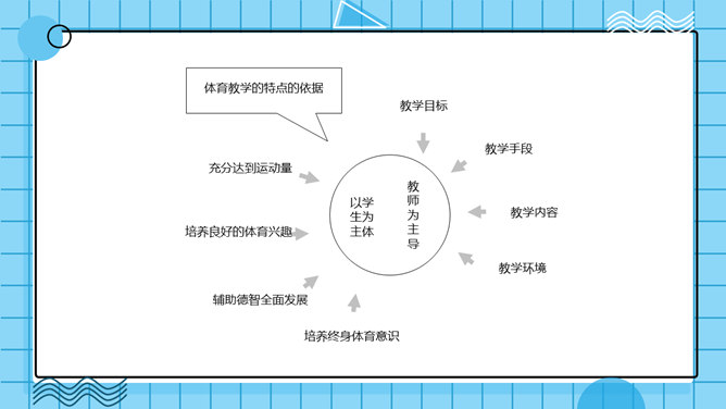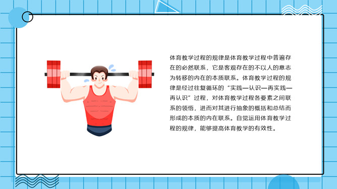 体育教学特点及规律PPT模板。体育教学过程是以教师为主导,学生为主体的认知过程。探讨体育教学过程的本质特征、规律及一般模式。其目的是为了推动体育教学质量的提高,实现体育教学过程的全面教育和全面发展的现代教学思想。