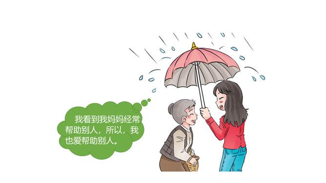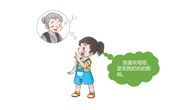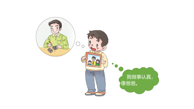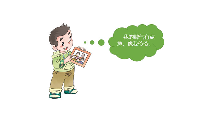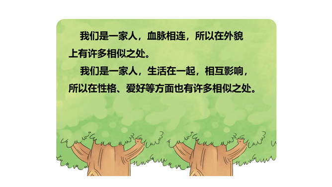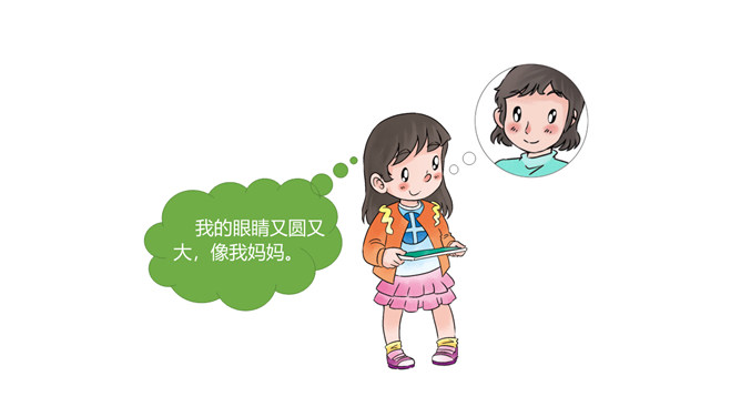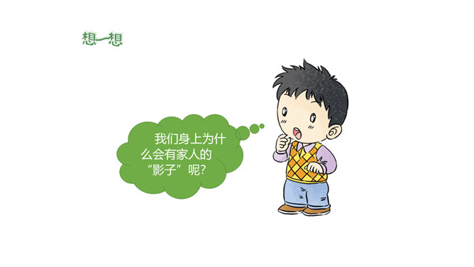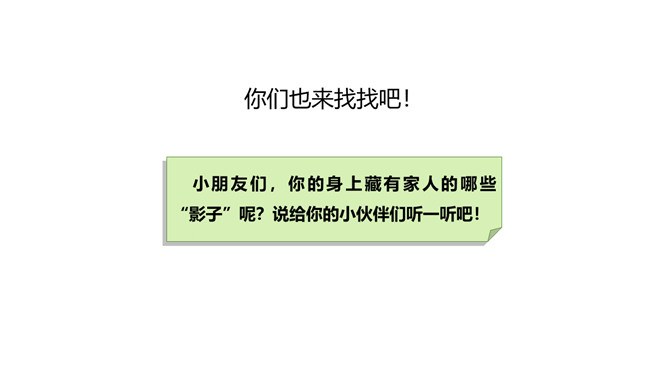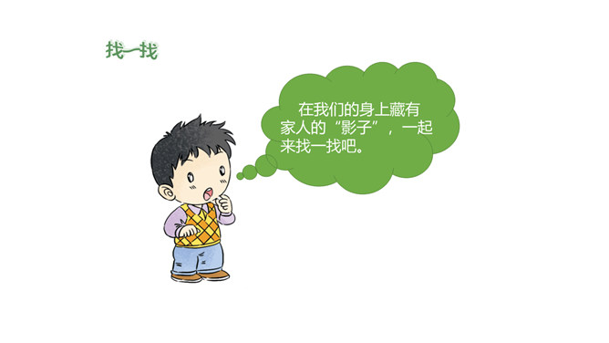 你找到了吗?在我们的身上藏有家人的“影子”,一起来找一找吧。我的眼睛又圆又大,像我妈妈。我的爸爸有一头浓密的黑发,我的头发也是又多又黑的哟。我喜欢唱歌,是受我奶奶的影响。我的脾气有点急,像我爷爷。我做事认真,像爸爸。我看到我妈妈经常帮助别人,所以,我也爱帮助别人。你们也来找找吧!小朋友们,你的身上藏有家人的哪些 “影子”呢?说给你的小伙伴们听一听吧!我们是一家人,血脉相连,所以在外貌上有许多相似之处。我们是一家人,生活在一起,相互影响,所以在性格、爱好等方面也有许多相似之处。所属专题:我和我的家ppt。