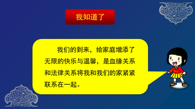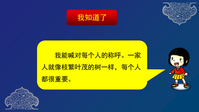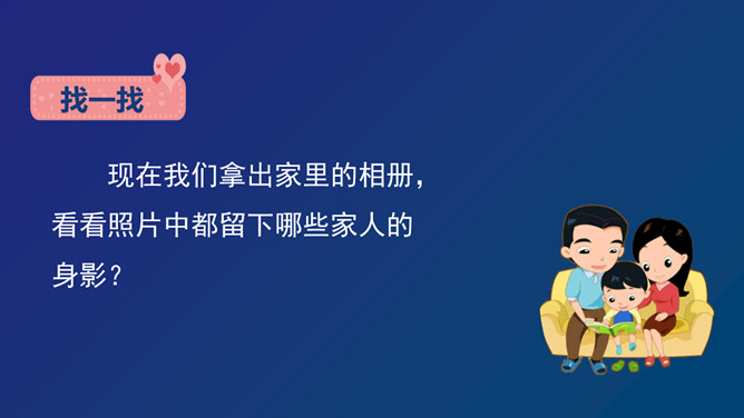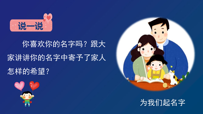 你喜欢你的名字吗?跟大家讲讲你的名字中寄予了家人怎样的希望?我们的到来,给家庭增添了无限的快乐与温馨,是血缘关系和法律关系将我和我们的家紧紧联系在一起。现在我们拿出家里的相册,看看照片中都留下哪些家人的身影?我能喊对每个人的称呼。一家人就像枝繁叶茂的树一样,每个人都很重要。受遗传因素的影响,我们有很多方面都和家人很像,当然也有和家人不一样的地方,正因为我们独一无二的存在,才使得这个世界多姿多彩。你了解你的家人吗?知道他们背后的故事吗?所属专题:我和我的家ppt。
