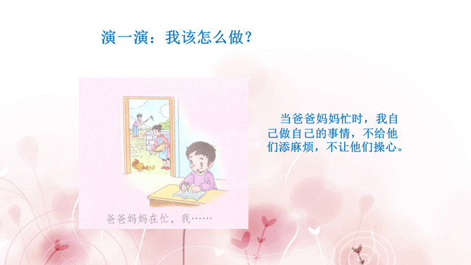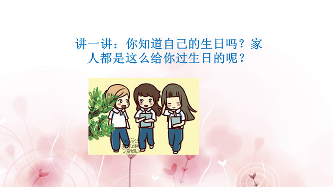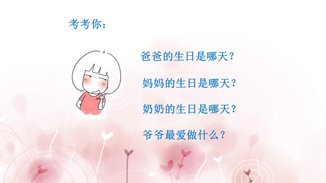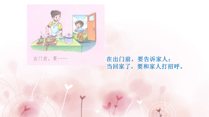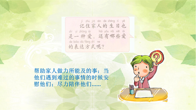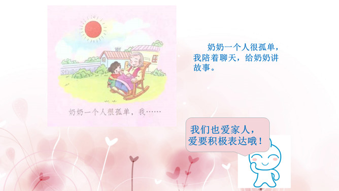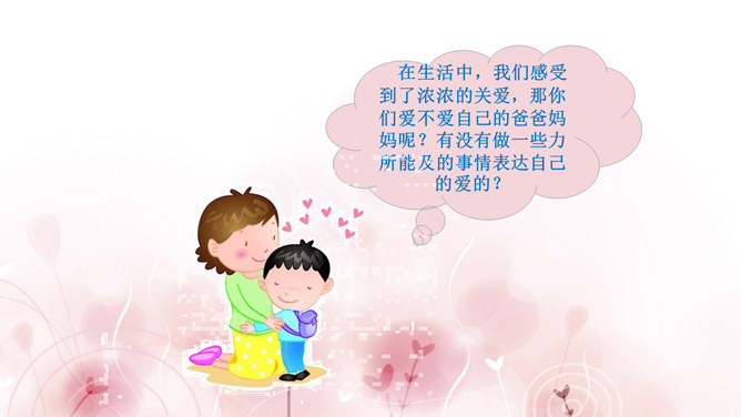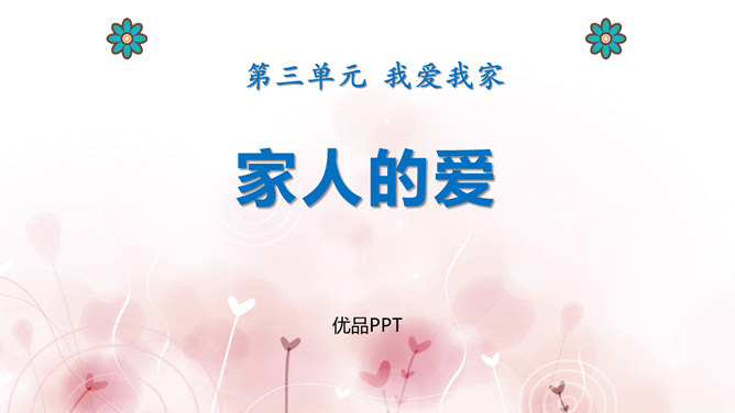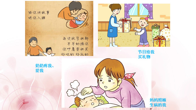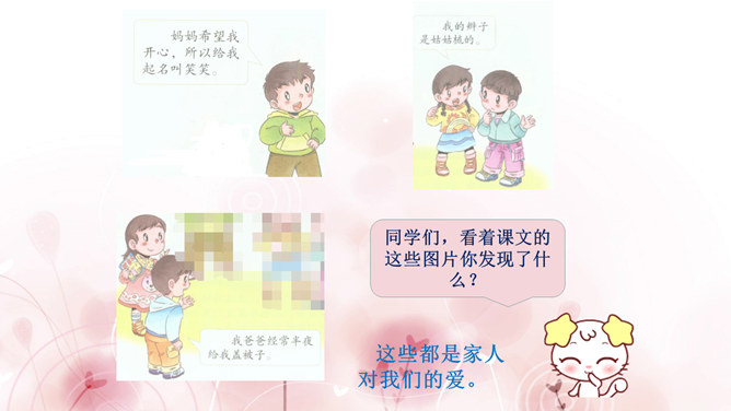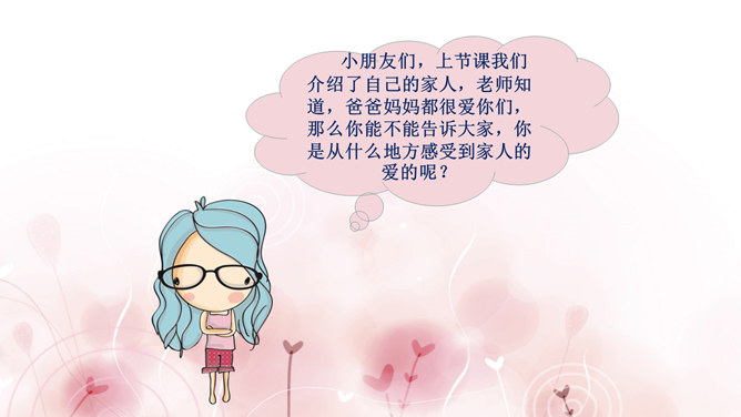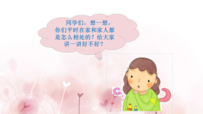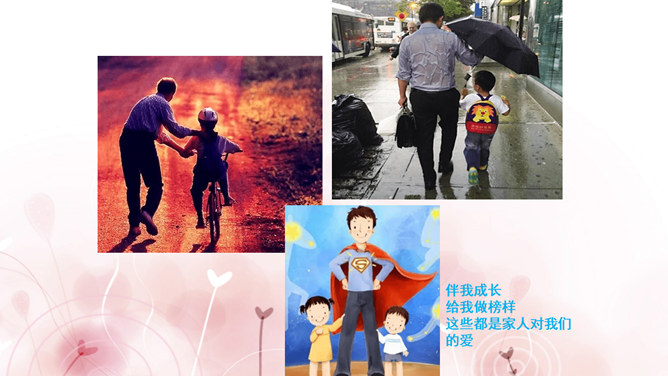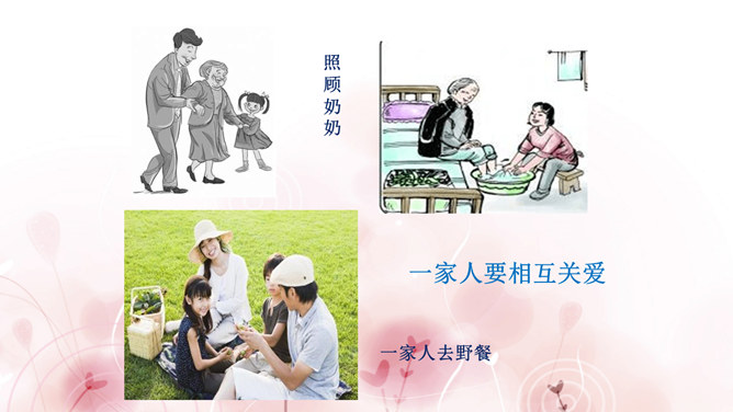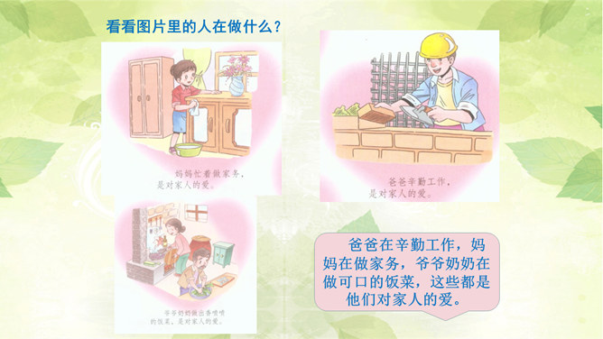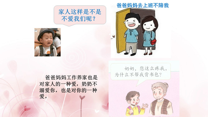 同学们,看着课文的这些图片你发现了什么?这些都是家人对我们的爱。小朋友们,上节课我们介绍了自己的家人,老师知道,爸爸妈妈都很爱你们,那么你能不能告诉大家,你是从什么地方感受到家人的爱的呢?爸爸在辛勤工作,妈妈在做家务,爷爷奶奶在做可口的饭菜,这些都是他们对家人的爱。家人这样是不是不爱我们呢?爸爸妈妈工作养家也是对家人的一种爱,奶奶不溺爱你,也是对你的一种爱。同学们,想一想,你们平时在家和家人都是怎么相处的?给大家讲一讲好不好?所属专题:家人的爱ppt。
