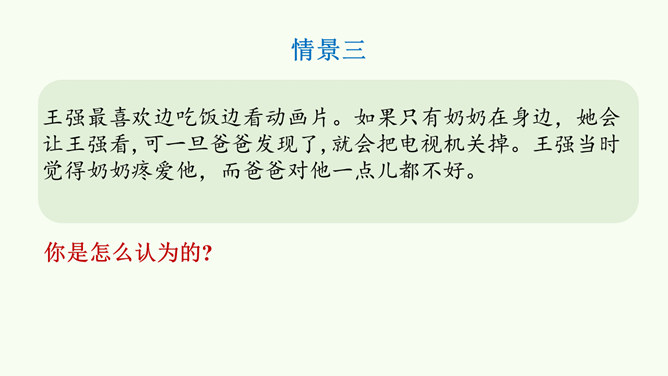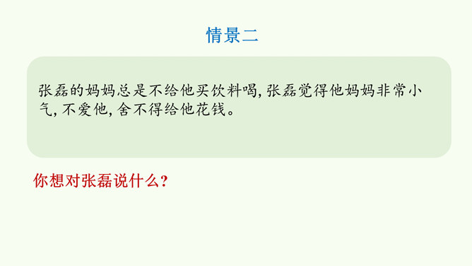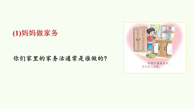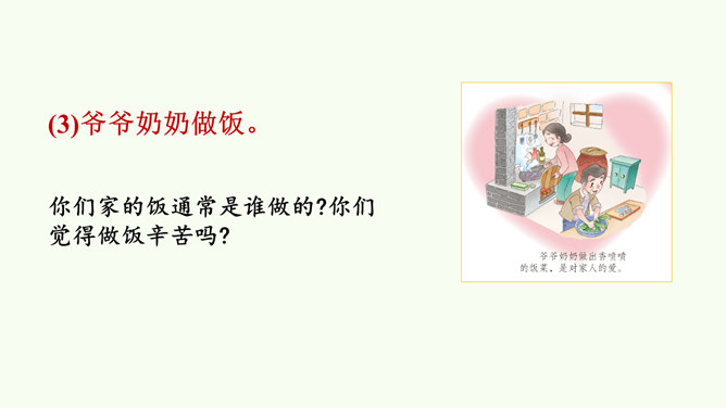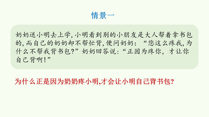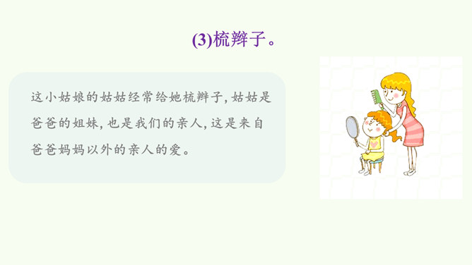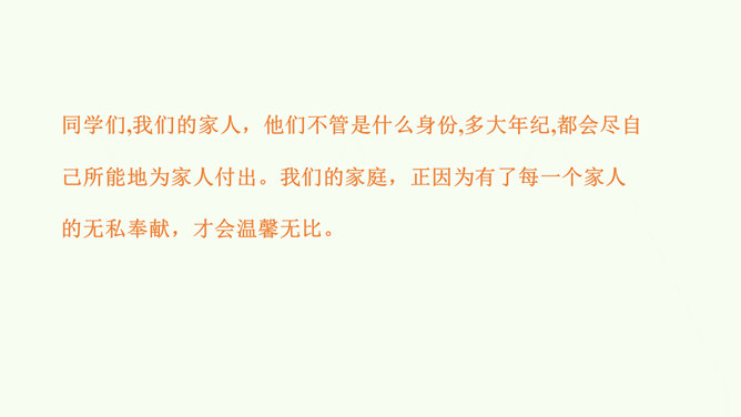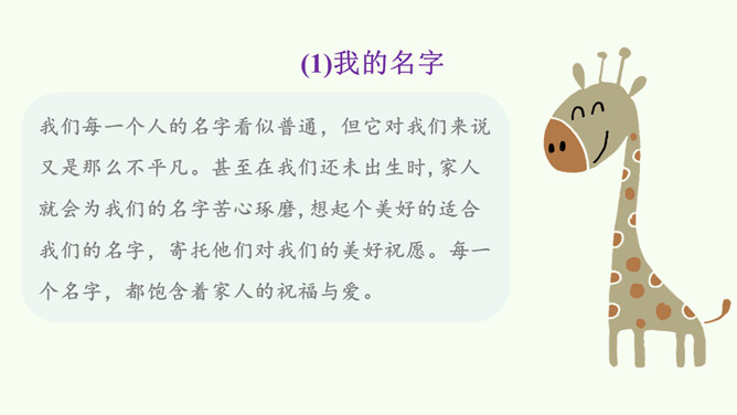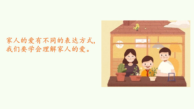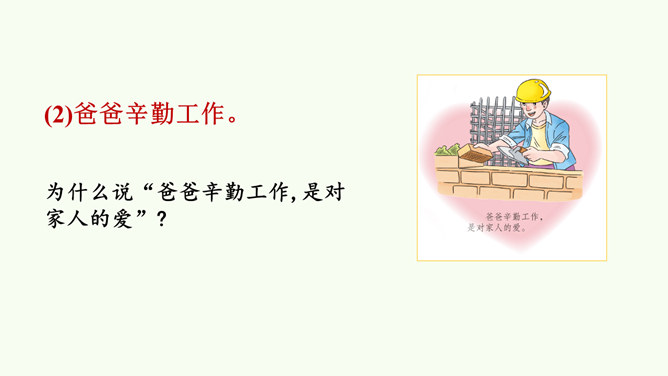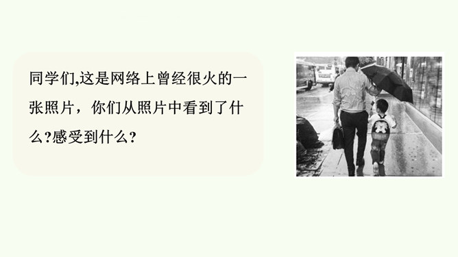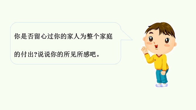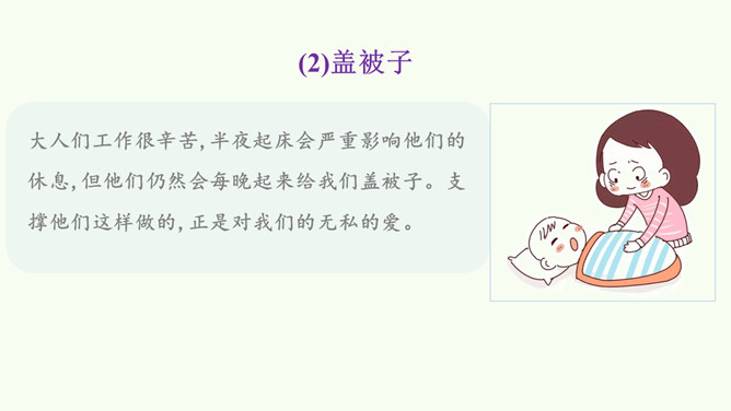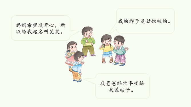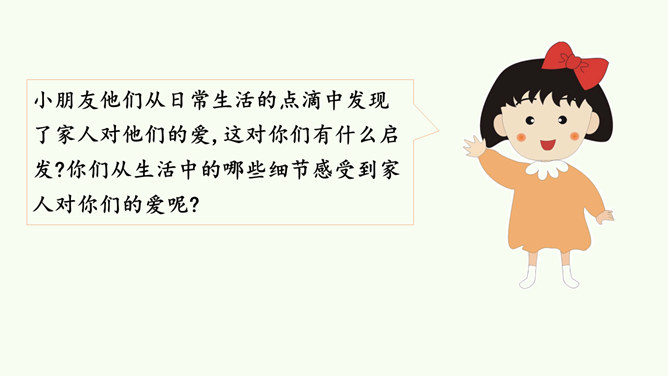 同学们,这是网络上曾经很火的一张照片,你们从照片中看到了什么?感受到什么?妈妈希望我开心,所以给我起名叫笑笑。我爸爸经常半夜给我盖被子。我的辫子是姑姑梳的。我们每一个人的名字看似普通,但它对我们来说又是那么不平凡。甚至在我们还未出生时,家人就会为我们的名字苦心琢磨,想起个美好的适合我们的名字,寄托他们对我们的美好祝愿。每一个名字,都饱含着家人的祝福与爱。人们工作很辛苦,半夜起床会严重影响他们的休息,但他们仍然会每晚起来给我们盖被子。支撑他们这样做的,正是对我们的无私的爱。所属专题:家人的爱ppt。