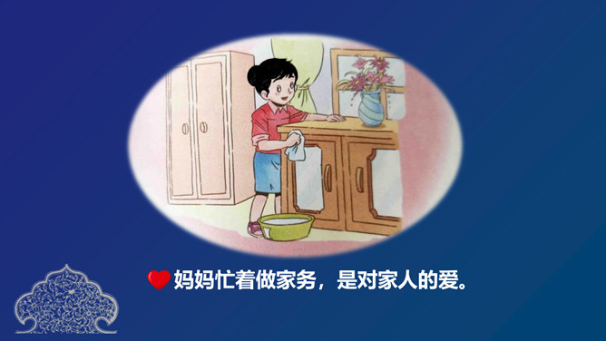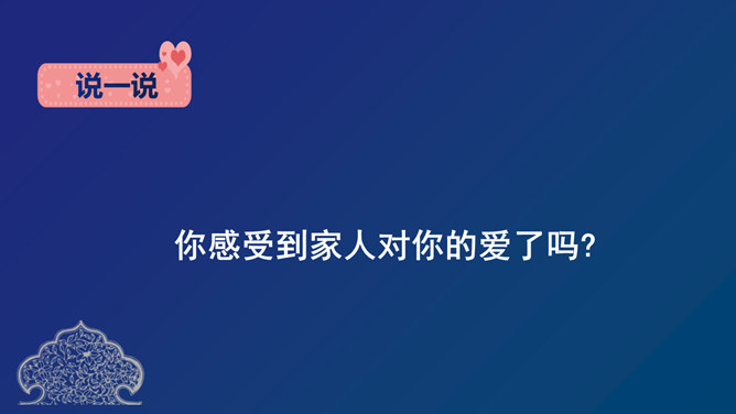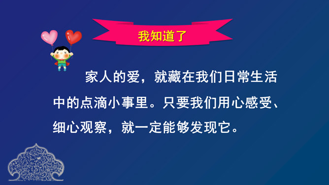 家人的爱,就藏在我们日常生活中的点滴小事里。只要我们用心感受、细心观察,就一定能够发现它。小硕把爸爸新买的杯子打碎了,他让爷爷别告诉爸爸。爷爷没有答应小硕。爷爷是不是不爱小硕了?兰兰写完作业,没有告诉奶奶就出去玩了。等她回来后,奶奶严厉地批评了她。奶奶还爱兰兰吗?小雅家里添了个小弟弟,爸爸妈妈经常照顾他,家里所有人都围绕着弟弟转。是不是小雅长大了,爸爸妈妈就不爱她了呢?你们愿意把自己家人相互关爱的小故事和大家分享吗?所属专题:家人的爱ppt。