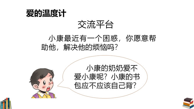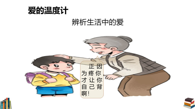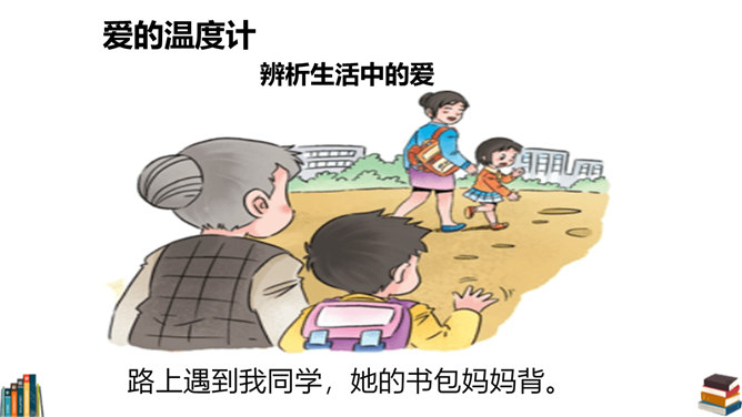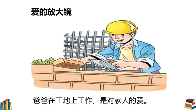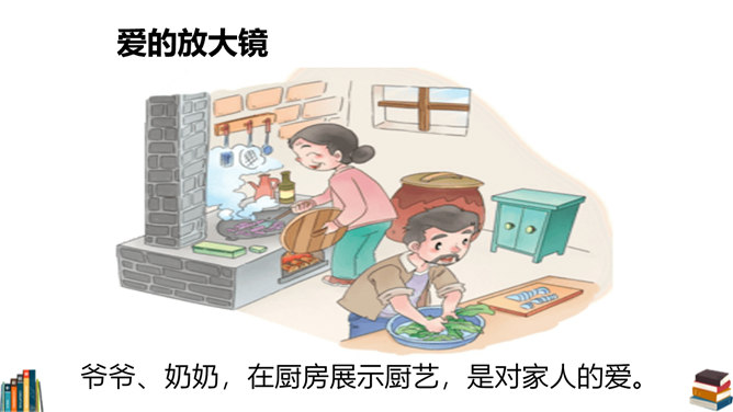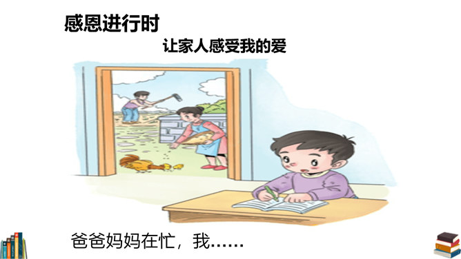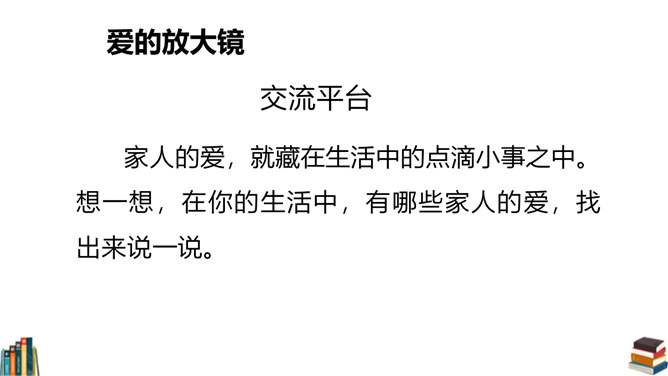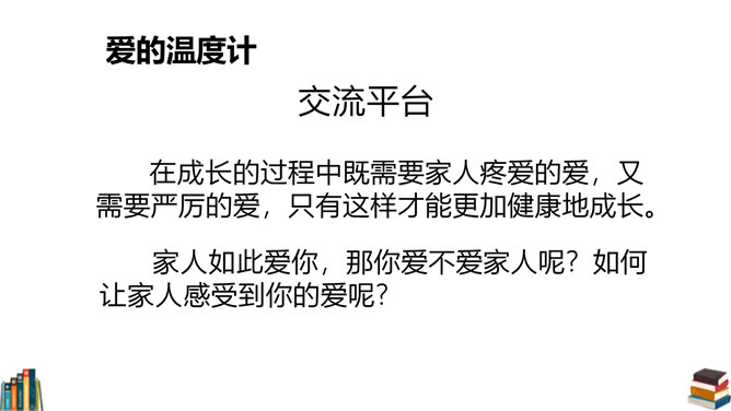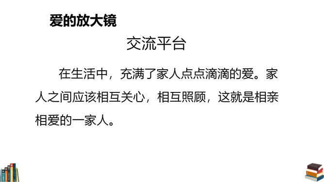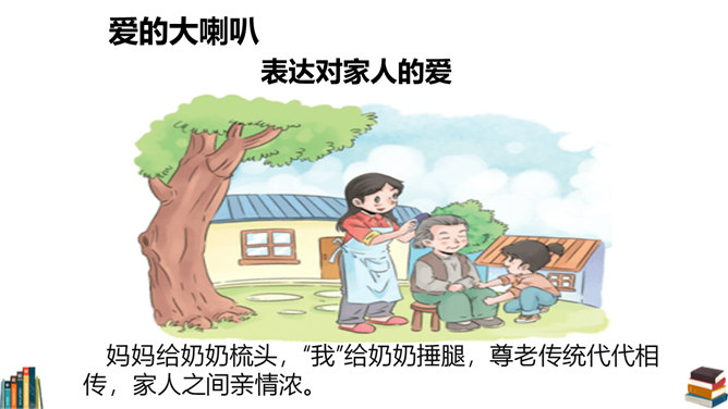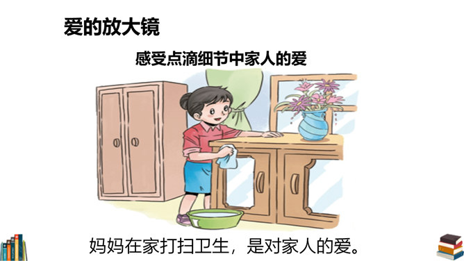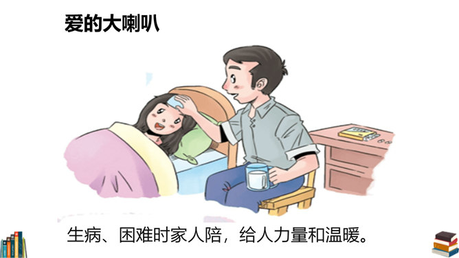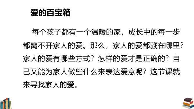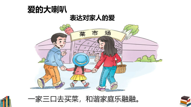 每个孩子都有一个温暖的家,成长中的每一步都离不开家人的爱。那么,家人的爱都藏在哪里?家人的爱有哪些方式?怎样的爱才是正确的?自己又能为家人做些什么来表达爱意呢?这节课就来寻找家人的爱。家人的爱,就藏在生活中的点滴小事之中。想一想,在你的生活中,有哪些家人的爱,找出来说一说。在生活中,充满了家人点点滴滴的爱。家人之间应该相互关心,相互照顾,这就是相亲相爱的一家人。在成长的过程中既需要家人疼爱的爱,又需要严厉的爱,只有这样才能更加健康地成长。所属专题:家人的爱ppt。