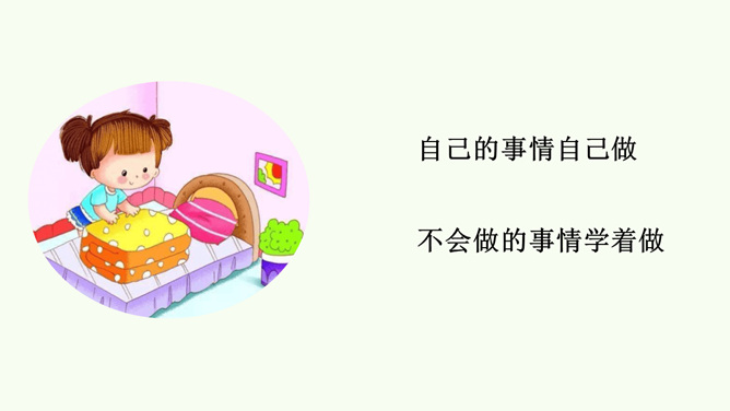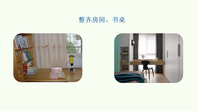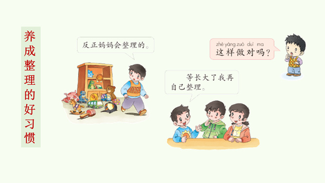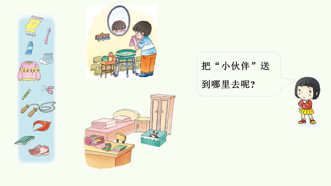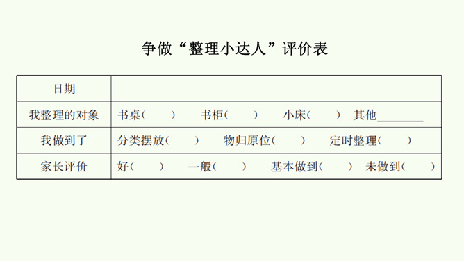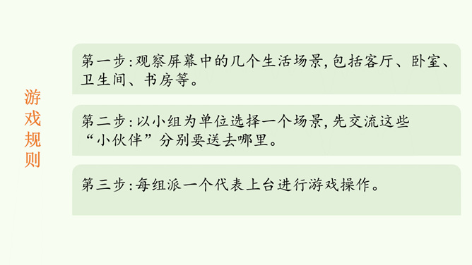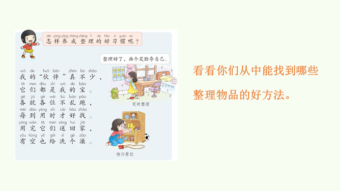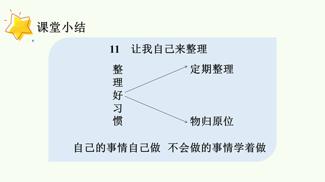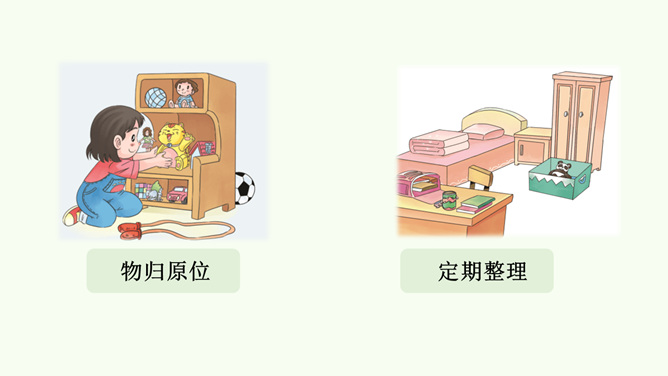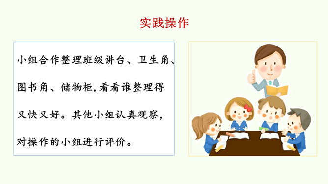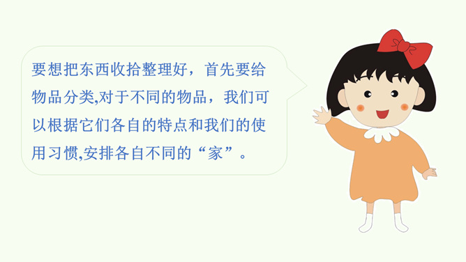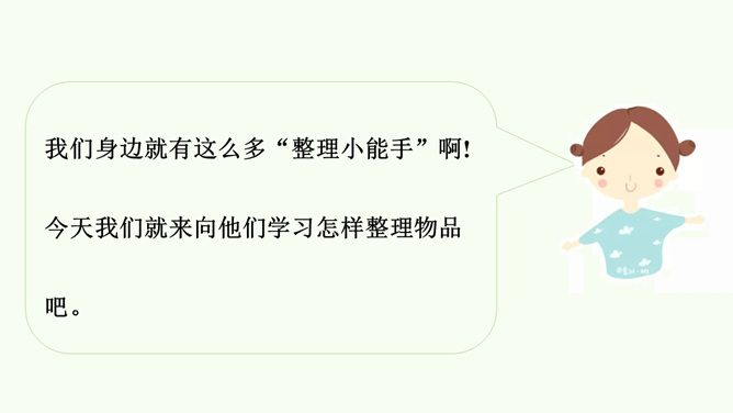 我们身边就有这么多“整理小能手”啊!今天我们就来向他们学习怎样整理物品吧。第一步:观察屏幕中的几个生活场景,包括客厅、卧室、卫生间、书房等。第二步:以小组为单位选择一个场景,先交流这些“小伙伴”分别要送去哪里。第三步:每组派一个代表上台进行游戏操作。要想把东西收拾整理好,首先要给物品分类,对于不同的物品,我们可以根据它们各自的特点和我们的使用习惯,安排各自不同的“家”。小组合作整理班级讲台、卫生角、图书角、储物柜,看看谁整理得又快又好。其他小组认真观察,对操作的小组进行评价。所属专题:让我自己来整理ppt。