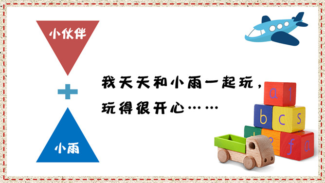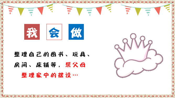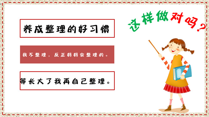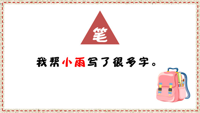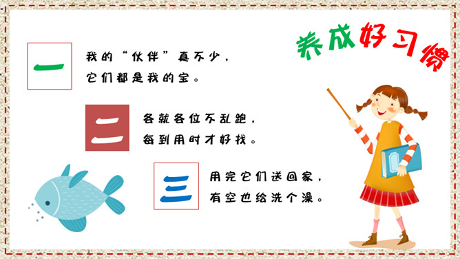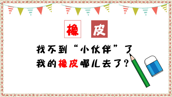 我天天和小雨一起玩,玩得很开心……我帮小雨写了很多字。两个小口袋,天天贴身带,如果带一只,就把人笑坏。小小船儿一对,坐着客人十位。白天忙着赶路,晚上靠岸休息。找不到“小伙伴”了我的橡皮哪儿去了?在刚才找东西的过程中,说说大家感受到什么困难?送“小伙伴”回家.把“小伙伴”送到哪里去呢?洗过脸后,把毛巾送哪去?整理自己的图书、玩具、房间、床铺等,帮父母整理家中的摆设…我的“伙伴”真不少,它们都是我的宝。各就各位不乱跑,每到用时才好找。所属专题:让我自己来整理ppt。