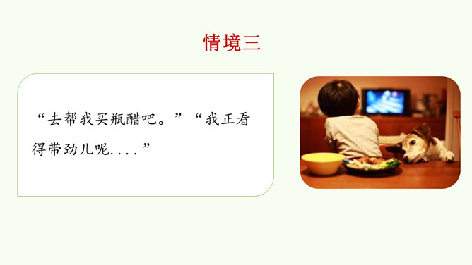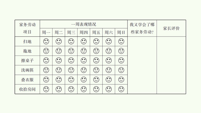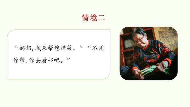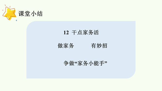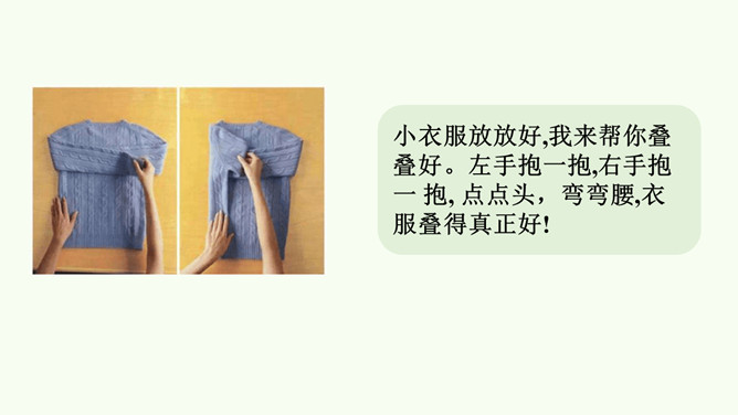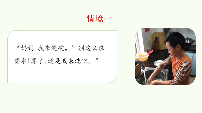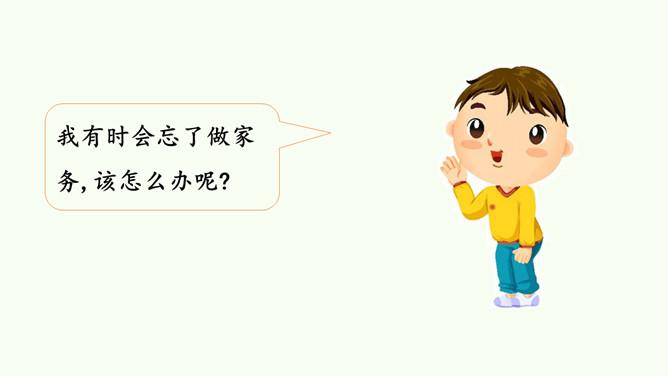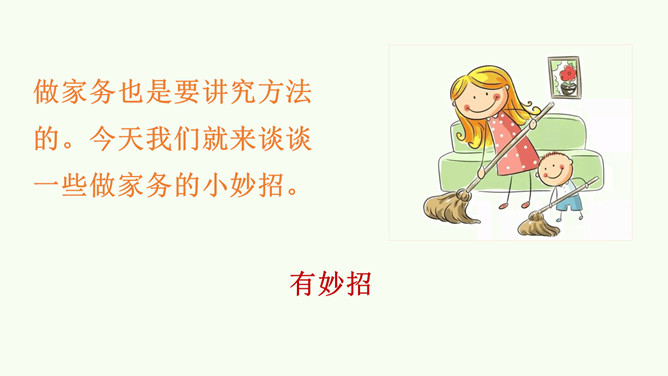 做家务也是要讲究方法的。今天我们就来谈谈一些做家务的小妙招。小衣服放放好,我来帮你叠叠好。左手抱一抱,右手抱一 抱, 点点头,弯弯腰,衣服叠得真正好!情境一:“妈妈,我来洗碗。”别这么浪费水!算了,还是我来洗吧。”情境二:“奶奶,我来帮您择菜。”“不用你帮,你去看书吧。”情境三:“去帮我买瓶醋吧。”“我正看得带劲儿呢....”我有时会忘了做家务,该怎么办呢?所属专题:干点家务活ppt。