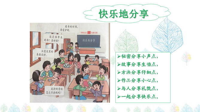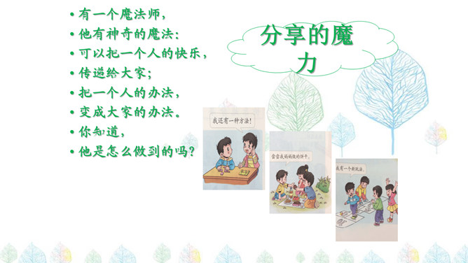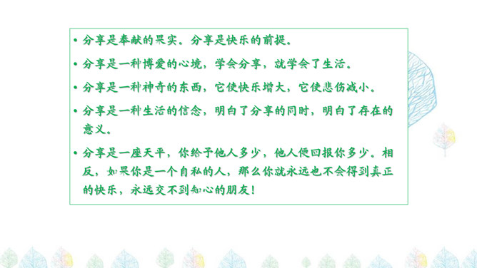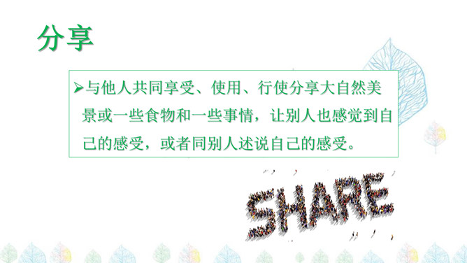 与他人共同享受、使用、行使分享大自然美景或一些食物和一些事情,让别人也感觉到自己的感受,或者同别人述说自己的感受。有一个魔法师,他有神奇的魔法:可以把一个人的快乐,传递给大家;把一个人的办法,变成大家的办法。你知道,他是怎么做到的吗?秘密分享小声点,故事分享生动点,方法分享仔细点,作品分享小心点,与人分享礼貌点,一起分享快乐点。分享是奉献的果实。分享是快乐的前提。分享是一种博爱的心境,学会分享,就学会了生活。分享是一种神奇的东西,它使快乐增大,它使悲伤减小。所属专题:分享真快乐ppt。