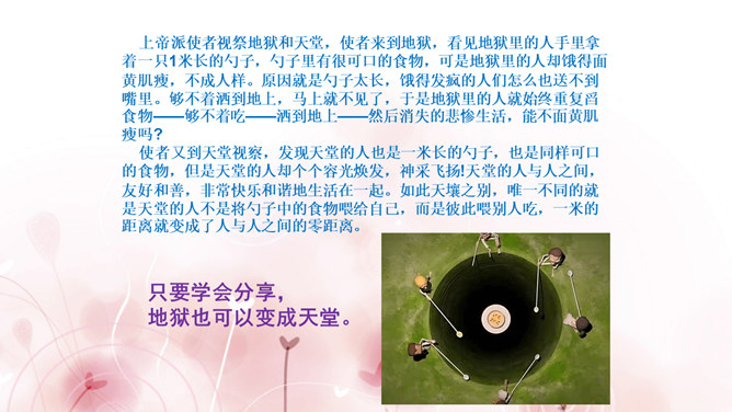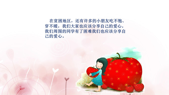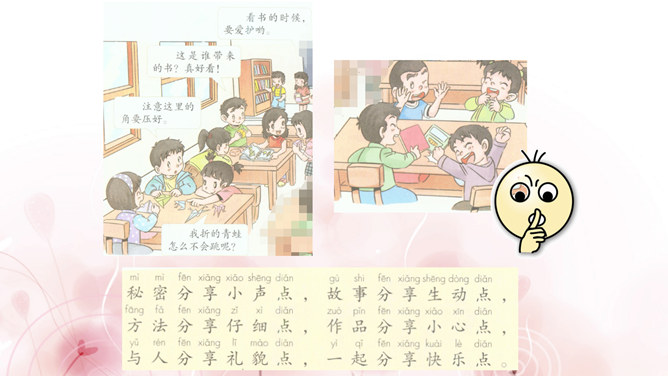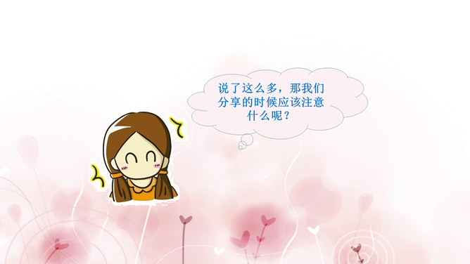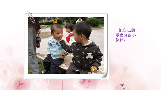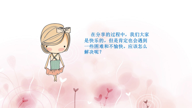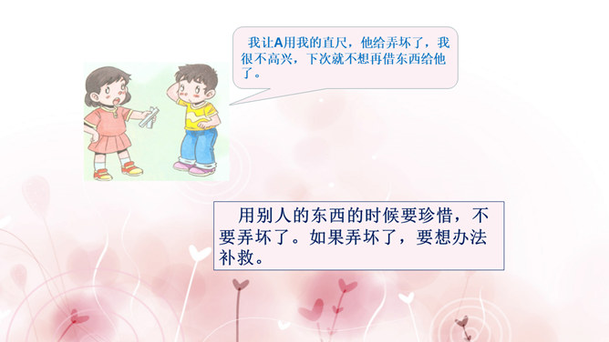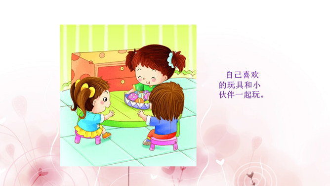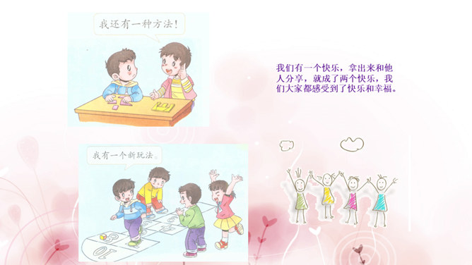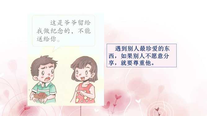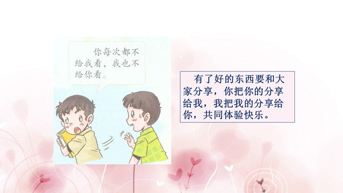 同学们,说一说你们理解的分享是什么?把自己喜欢的书带给同学一起看。把自己的零食分给小伙伴。自己喜欢的玩具和小伙伴一起玩。我们有一个快乐,拿出来和他人分享,就成了两个快乐,我们大家都感受到了快乐和幸福。说了这么多,那我们分享的时候应该注意什么呢?在分享的过程中,我们大家是快乐的,但是肯定也会遇到一些困难和不愉快。应该怎么解决呢?用别人的东西的时候要珍惜,不要弄坏了。如果弄坏了,要想办法补救。遇到别人最珍爱的东西,如果别人不愿意分享,就要尊重他。所属专题:分享真快乐ppt。