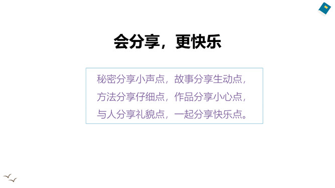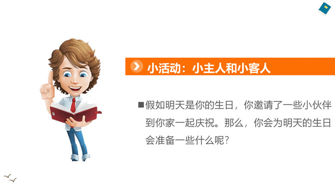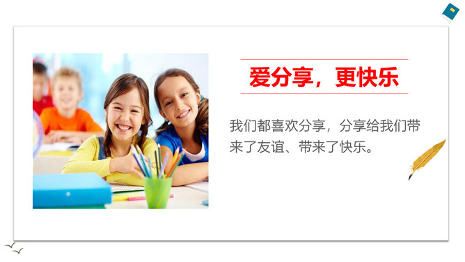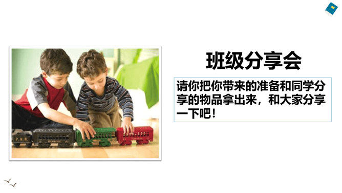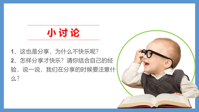 小活动:小主人和小客人。假如明天是你的生日,你邀请了一些小伙伴到你家一起庆祝。那么,你会为明天的生日会准备一些什么呢?请你把你带来的准备和同学分享的物品拿出来,和大家分享一下吧!我们都喜欢分享,分享给我们带来了友谊、带来了快乐。分享很快乐,有时也有小烦恼。你乐于与别人分享,别人也会乐于与你分享;你爱惜别人的分享,别人也会珍惜你的分享;有些东西是不能分享的,不要强求别人分享。在班级生活中,学会分享、懂得分享,你会收获更多的更有和快乐。所属专题:分享真快乐ppt。