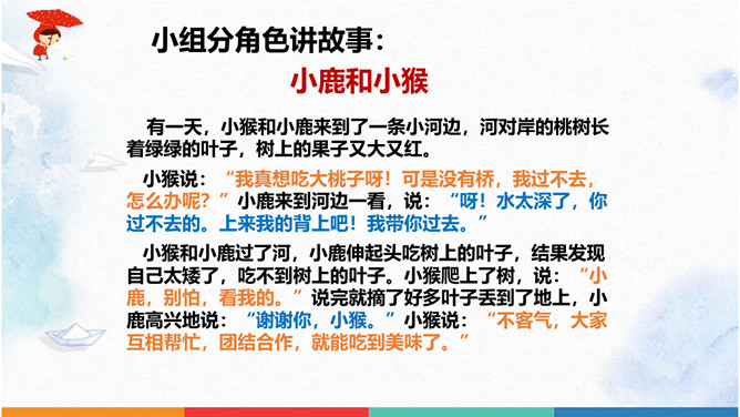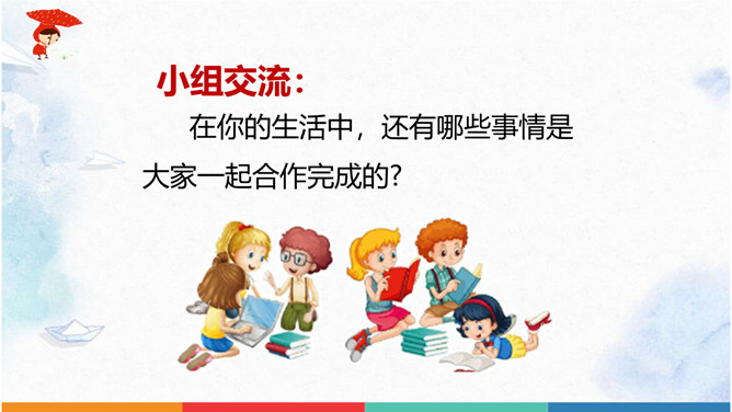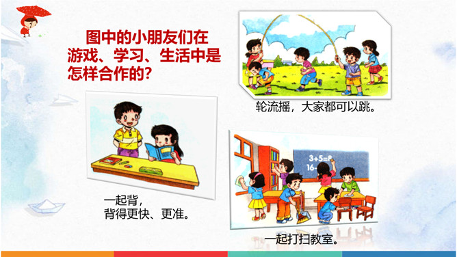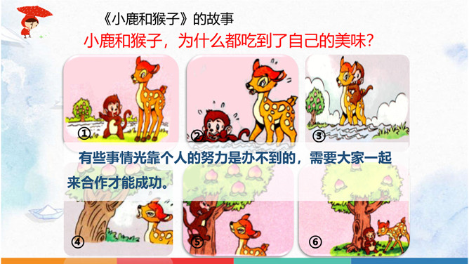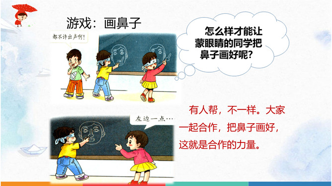 游戏:画鼻子。怎么样才能让蒙眼睛的同学把鼻子画好呢?有人帮,不一样。大家一起合作,把鼻子画好,这就是合作的力量。《小鹿和猴子》的故事。小鹿和猴子,为什么都吃到了自己的美味?有些事情光靠个人的努力是办不到的,需要大家一起来合作才能成功。图中的小朋友们在游戏、学习、生活中是怎样合作的?小组交流:在你的生活中,还有哪些事情是大家一起合作完成的?谈收获:通过这节课的学习,你知道了什么?所属专题:大家一起来ppt。