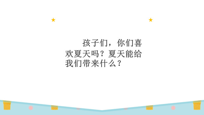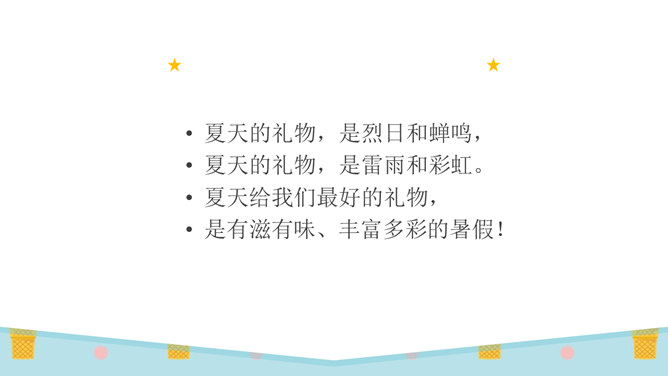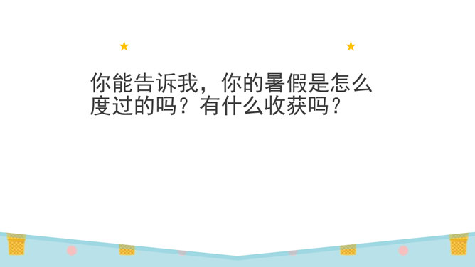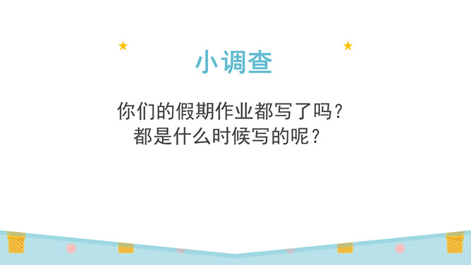 孩子们,你们喜欢夏天吗?夏天能给我们带来什么?夏天的礼物,是烈日和蝉鸣,夏天的礼物,是雷雨和彩虹。夏天给我们最好的礼物,是有滋有味、丰富多彩的暑假!你能告诉我,你的暑假是怎么度过的吗?有什么收获吗?什么是收获?收取成熟的农产品。比喻获得成果或得到的战果。上节课通过大家的讲述、交流,我们了解到同学们的假期生活真是丰富多彩,精彩纷呈呀!你们的假期作业都写了吗?都是什么时候写的呢?听同学们这么一说,我到想起了两个小朋友,他们跟你们的情况差不多,我们一起来看一看他们是怎么过暑假的?所属专题:假期有收获ppt。