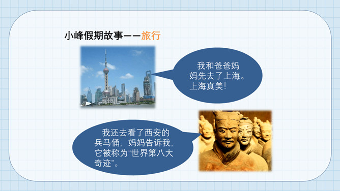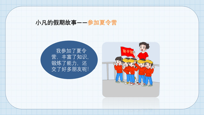 我参加了夏令营,丰富了知识,锻炼了能力,还交了好多朋友呢!我和爸爸妈妈先去了上海。上海真美!我还去看了西安的兵马俑,妈妈告诉我,它被称为“世界第八大奇迹”。假期里,我按每周读一本书的计划,读了八本书,妈妈说我是个可爱的小书虫!刚回去的时候,田地里的玉米还是小秧苗呢。住了一段时间,长出大玉米了!假期中,我们需要合理安排,积极参与,用心感受,这样,我们的假期不仅快乐,还会有很多收获。每位同学都有自己喜欢的度假方式。夏天给我们最好的礼物,就是有滋有味、丰富多彩的暑假!所属专题:假期有收获ppt。
