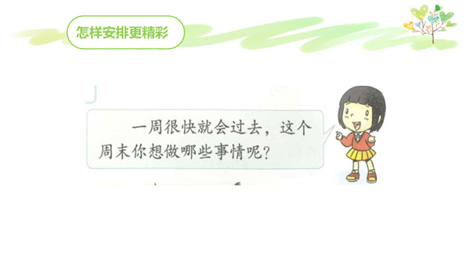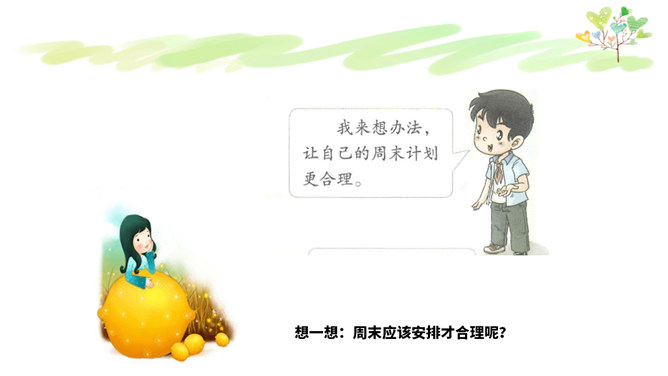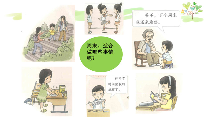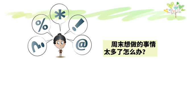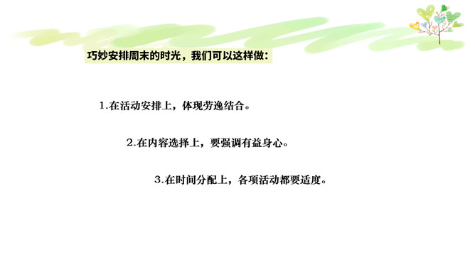 周末,适合做哪些事情呢?周末想做的事情太多了怎么办?想一想:周末应该安排才合理呢?巧妙安排周末的时光,我们可以这样做:1.在活动安排上,体现劳逸结合。2.在内容选择上,要强调有益身心。3.在时间分配上,各项活动都要适度。所属专题:周末巧安排ppt。