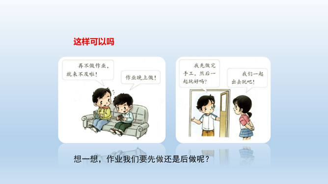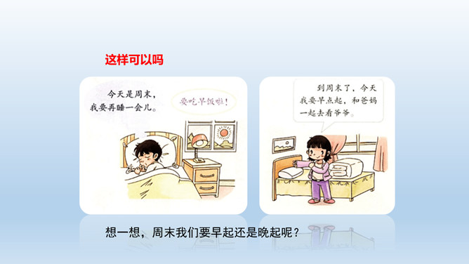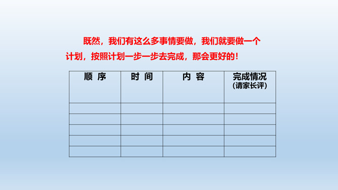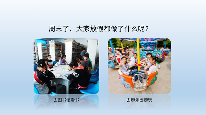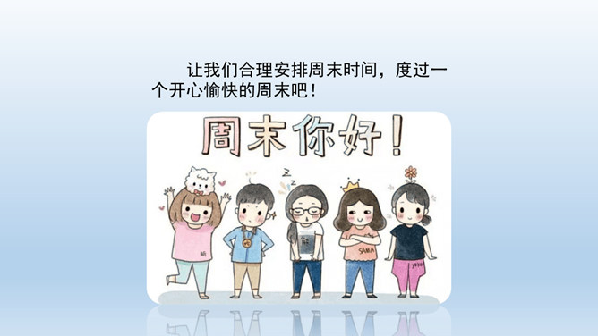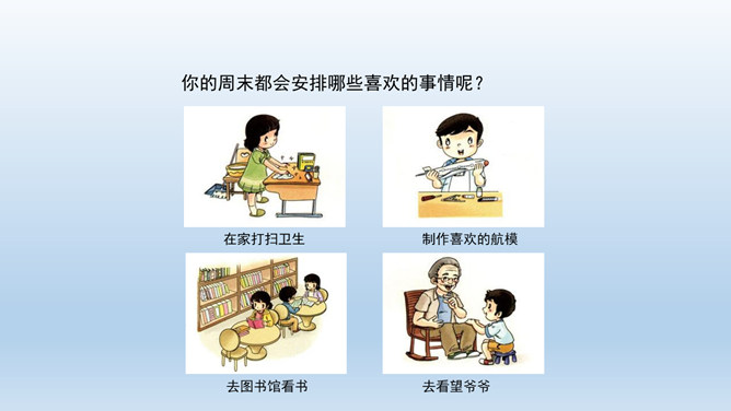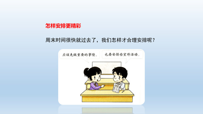 周末了,大家放假都做了什么呢?去图书馆看书、去游乐园游玩。想一想,周末我们要早起还是晚起呢?想一想,作业我们要先做还是后做呢?周末时间很快就过去了,我们怎样才合理安排呢?你的周末都会安排哪些喜欢的事情呢?在家打扫卫生、制作喜欢的航模、去看望爷爷。既然,我们有这么多事情要做,我们就要做一个计划,按照计划一步一步去完成,那会更好的!让我们合理安排周末时间,度过一个开心愉快的周末吧!所属专题:周末巧安排ppt。