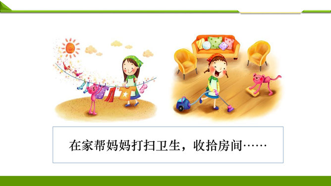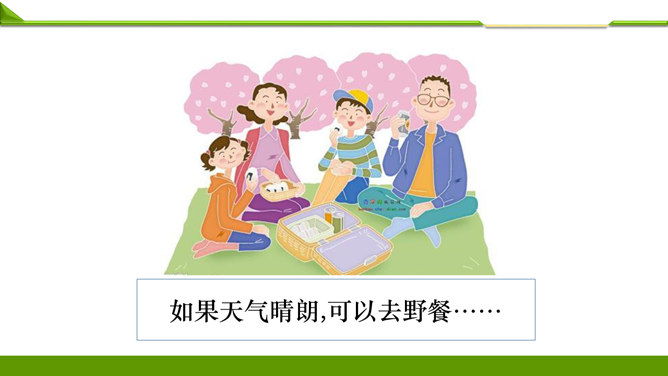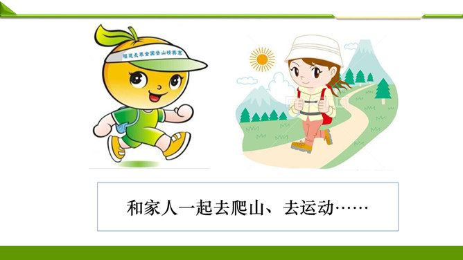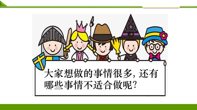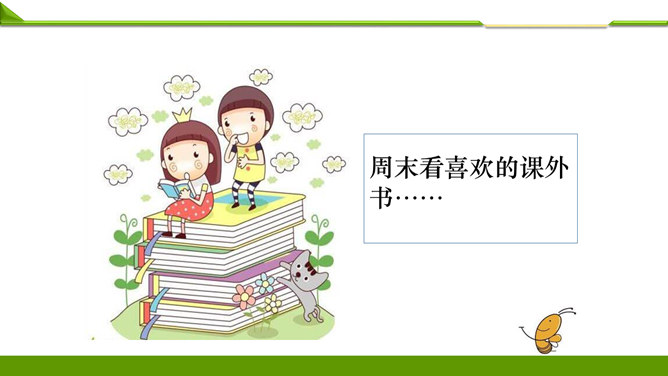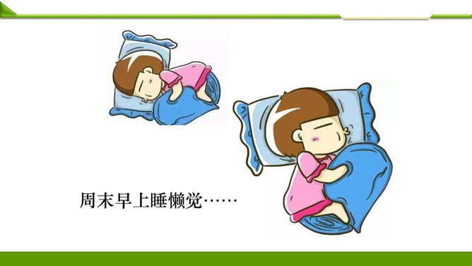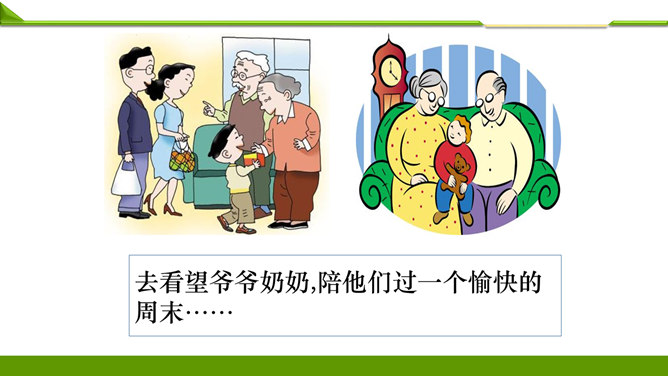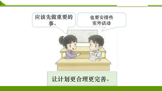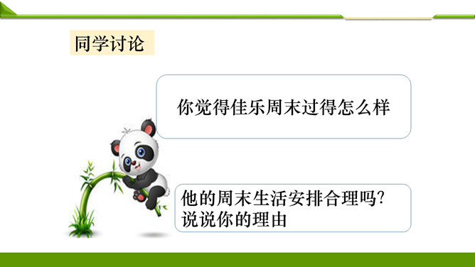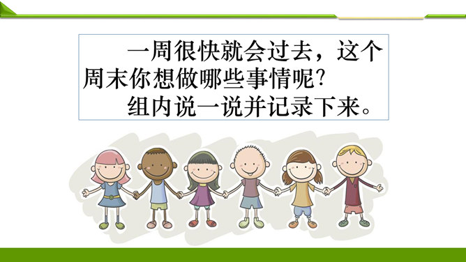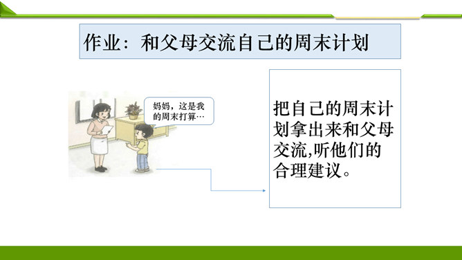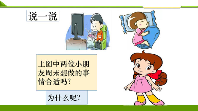 一周很快就会过去,这个周末你想做哪些事情呢?组内说一说并记录下来。周末看喜欢的课外书……和好朋友在一起尽情地玩……终于有时间玩自己喜欢的模型了……和家人一起去爬山、去运动……如果天气晴朗,可以去野餐……在家帮妈妈打扫卫生,收拾房间……去看望爷爷奶奶,陪他们过一个愉快的周末……大家想做的事情很多, 还有哪些事情不适合做呢?长时间看电视……周末早上睡懒觉……上图中两位小朋友周末想做的事情合适吗?为什么呢?他的周末生活安排合理吗?说说你的理由。所属专题:周末巧安排ppt。