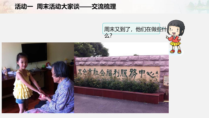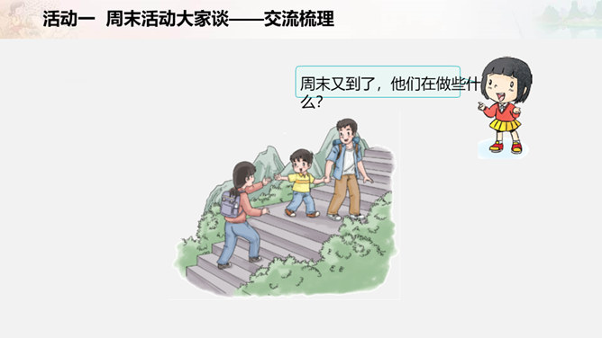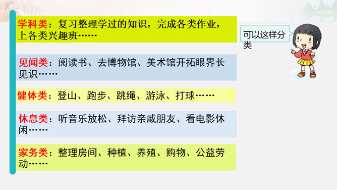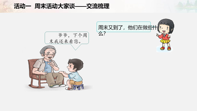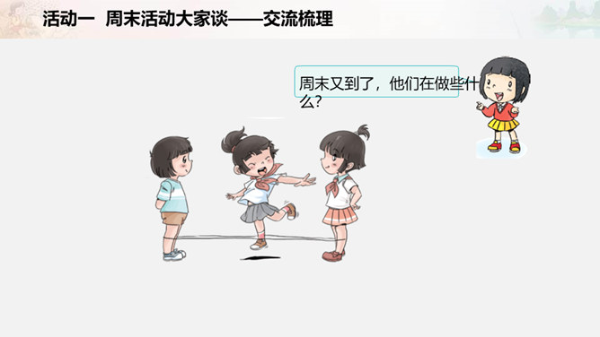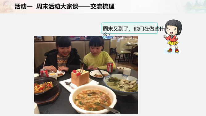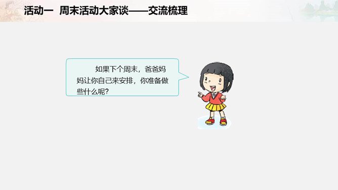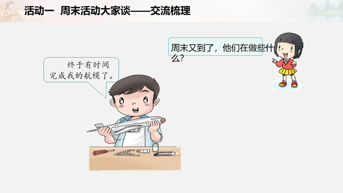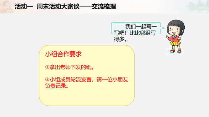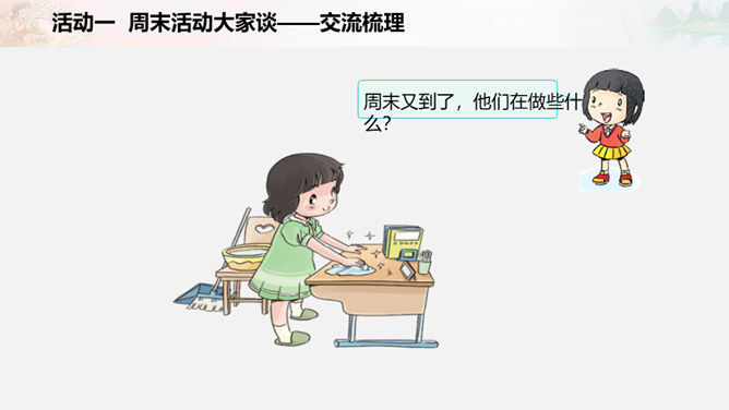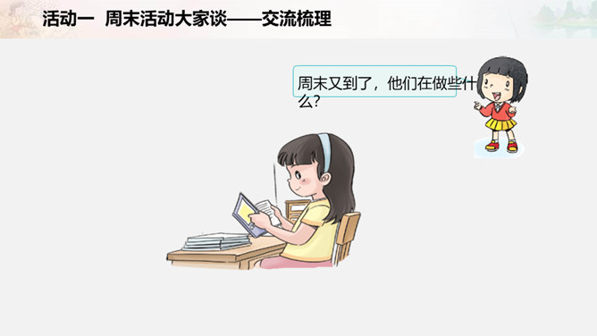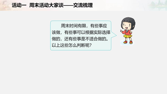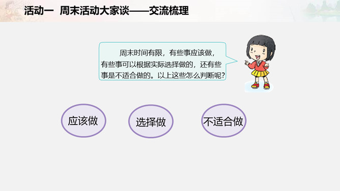 周末又到了,他们在做些什么?如果下个周末,爸爸妈妈让你自己来安排,你准备做些什么呢?我们一起写一写吧!比比哪组写得多。小组合作要求:拿出老师下发的纸。小组成员轮流发言,请一位小朋友负责记录。周末时间有限,有些事应该做,有些事可以根据实际选择做的,还有些事是不适合做的。以上这些怎么判断呢?做事要有顺序。要先完成紧急且重要的事情,比如学习。再做重要但不紧急的事情,比如锻炼身体。最后解决不重要也不紧急的事情,比如娱乐活动。所属专题:周末巧安排ppt。